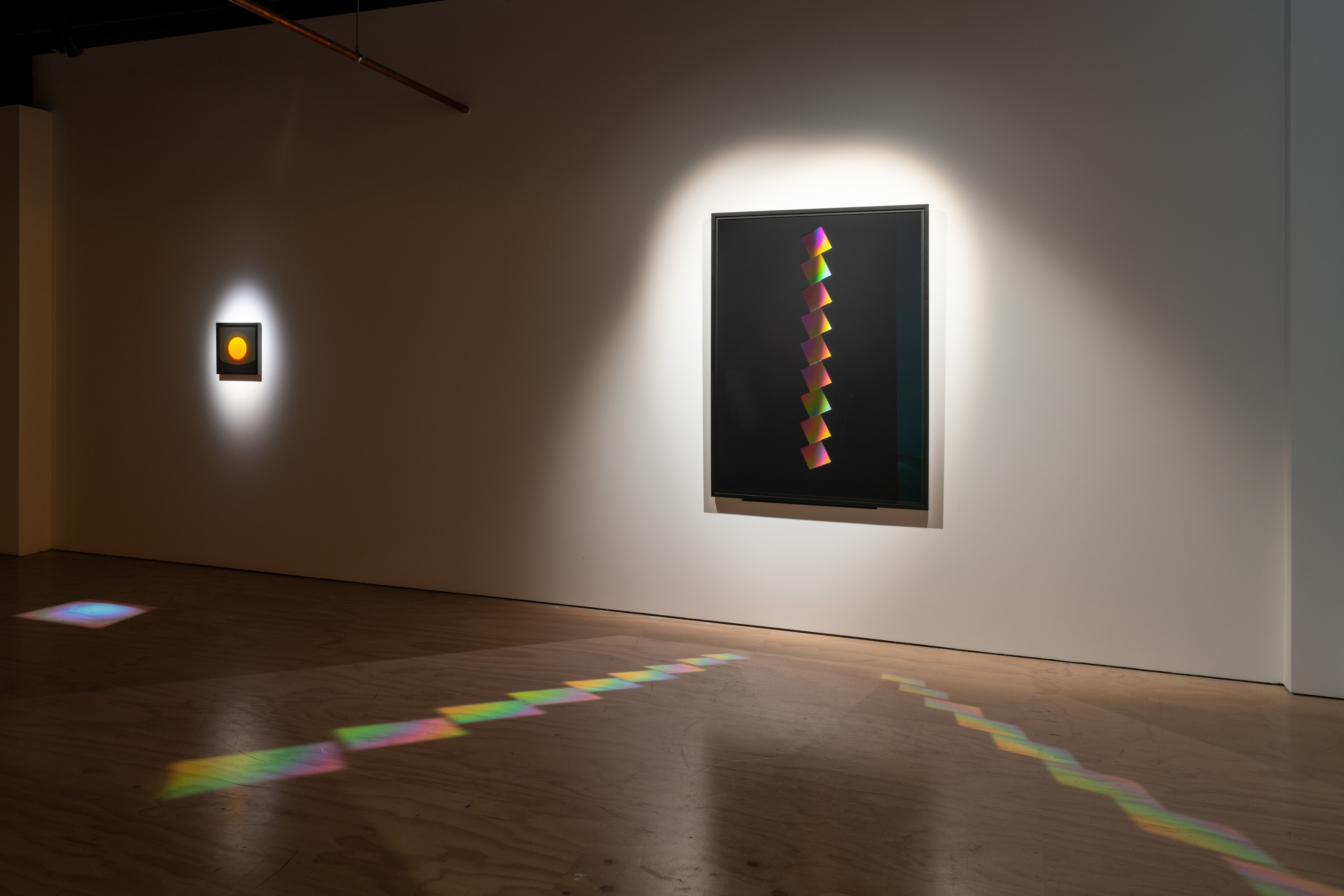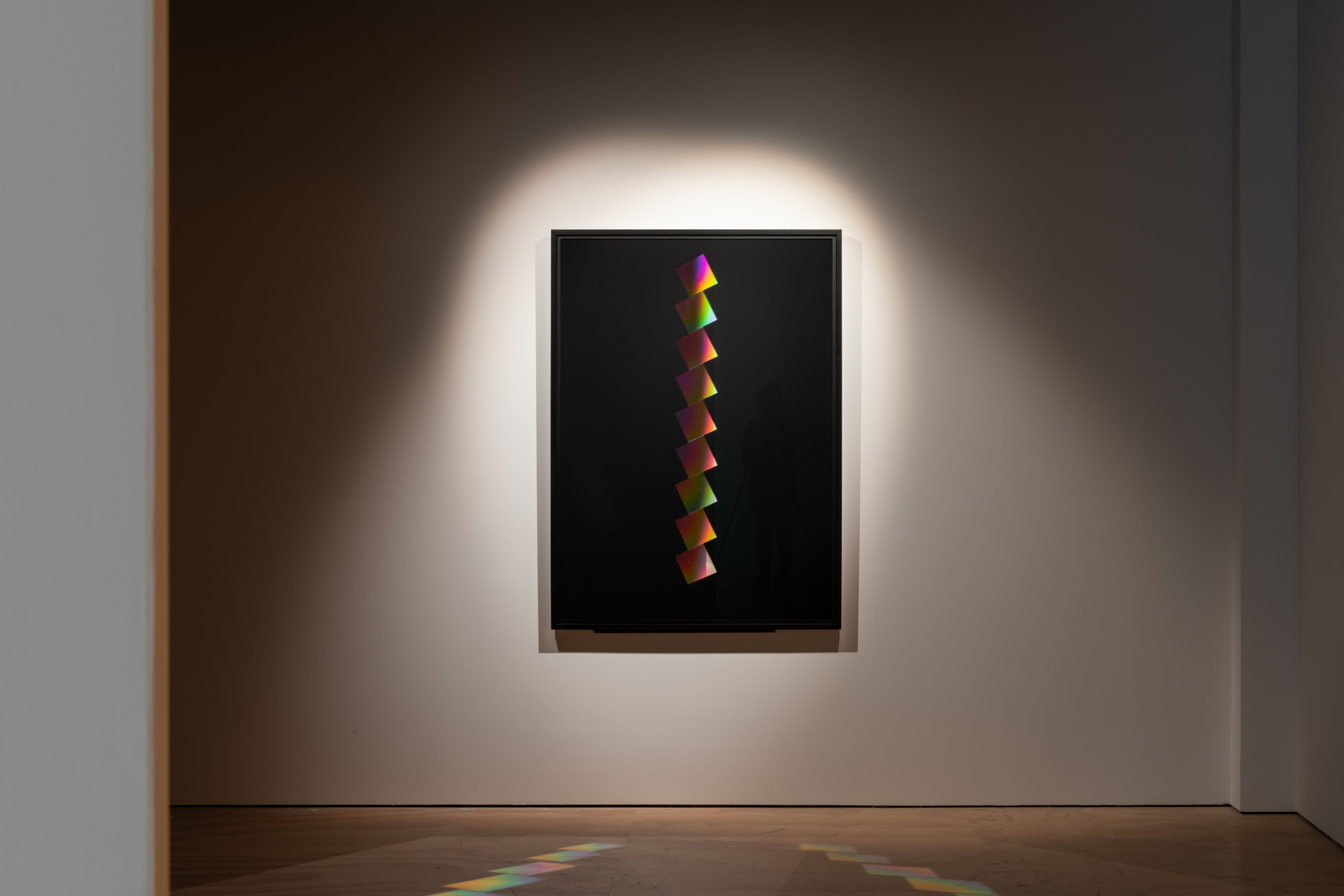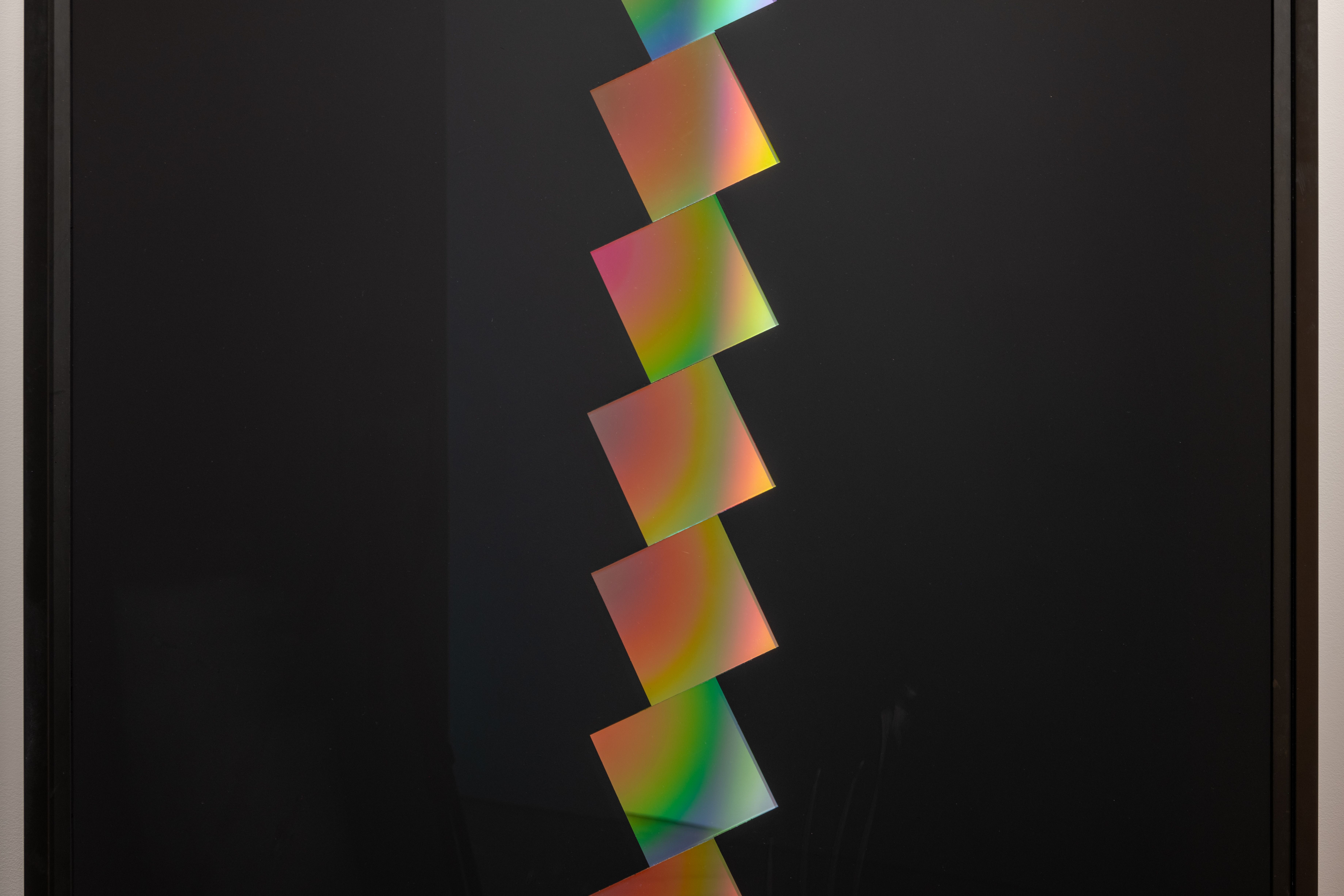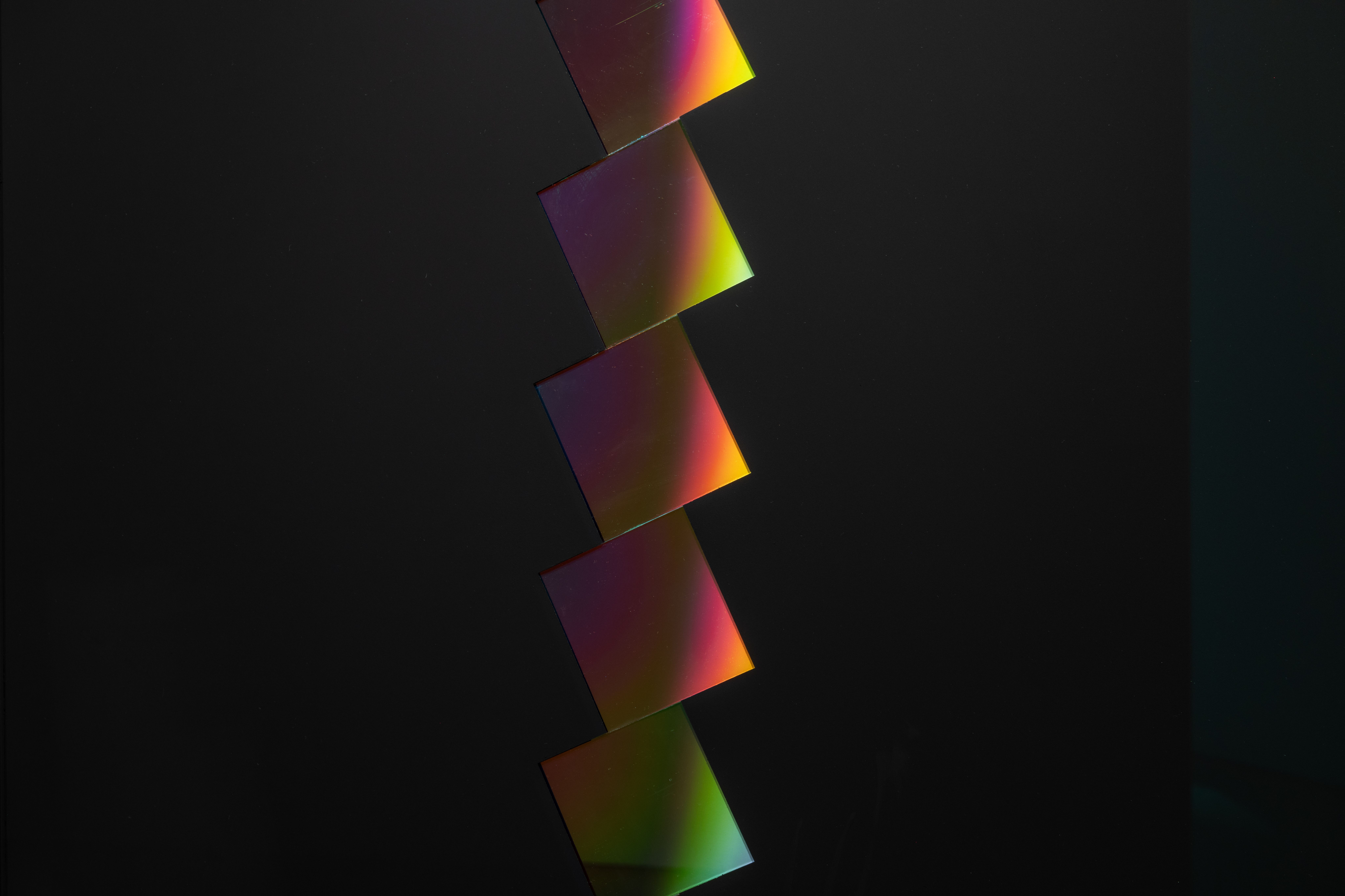 In Andrew Beck’s new works, iridescent titanium-coated glass panels glisten like the compound eyes of insects, their colour shifting as the viewer’s eye moves in relation to them. Insects’ eyes function as a series of independently operating light and colour sensors, giving them a wide field of view and the ability to perceive colours that lie outside the spectrum visible to humans and other mammals, such as ultraviolet frequencies. Beck’s work offers a twist on traditional abstraction, asking the viewer to consider the aesthetic qualities of light itself, and the tenuous, ephemeral visual effects created by its fleeting passage over the retina.