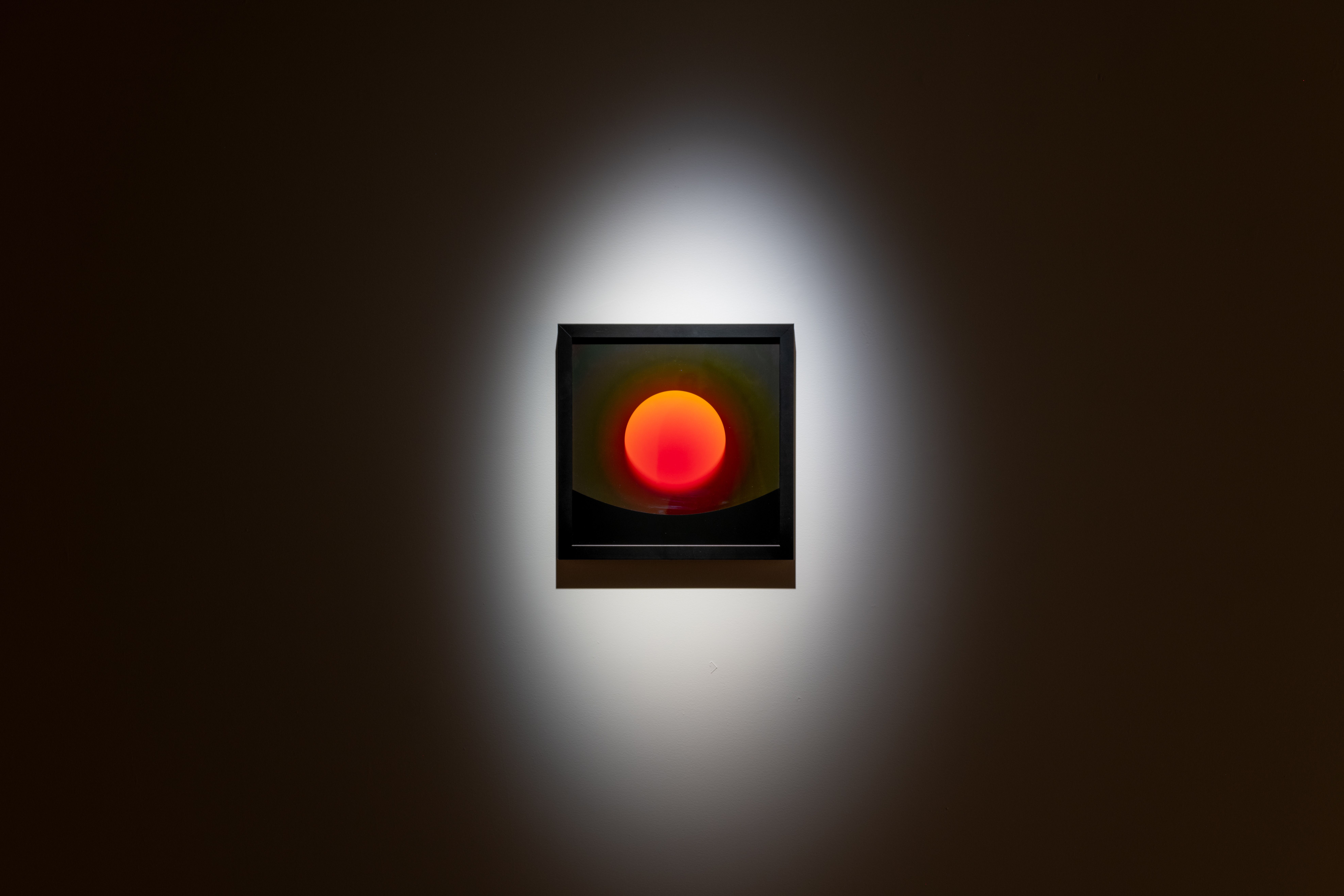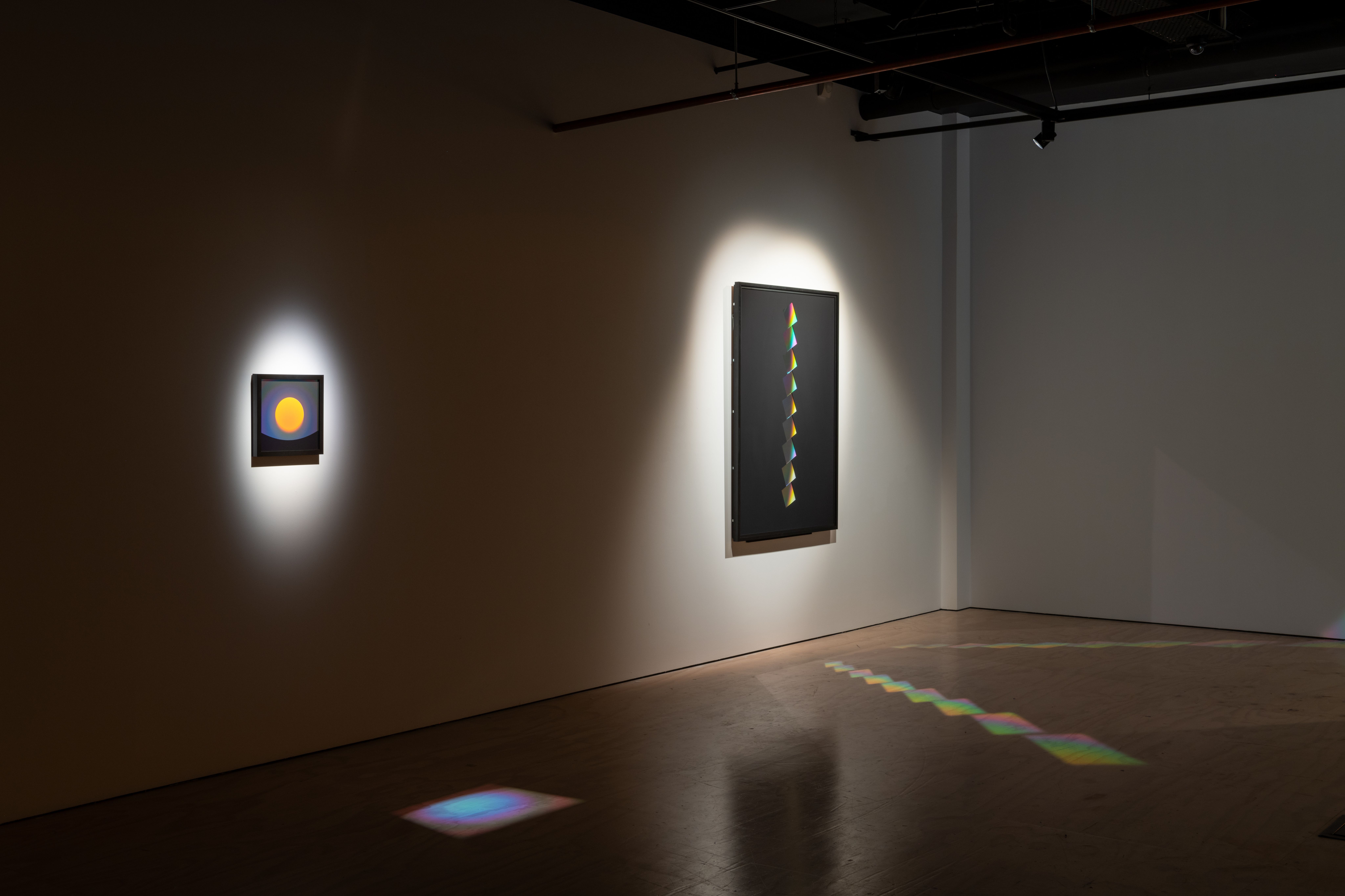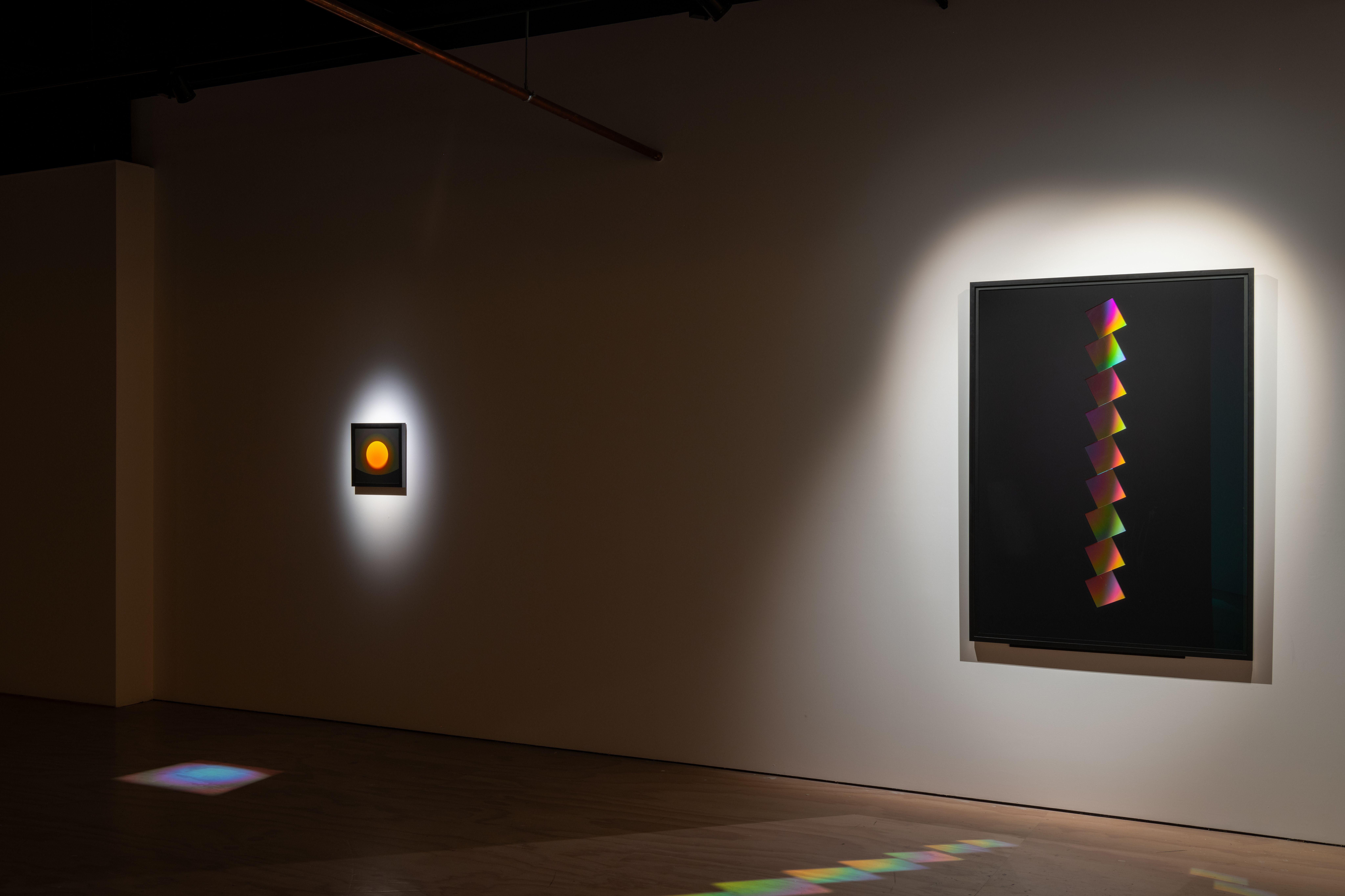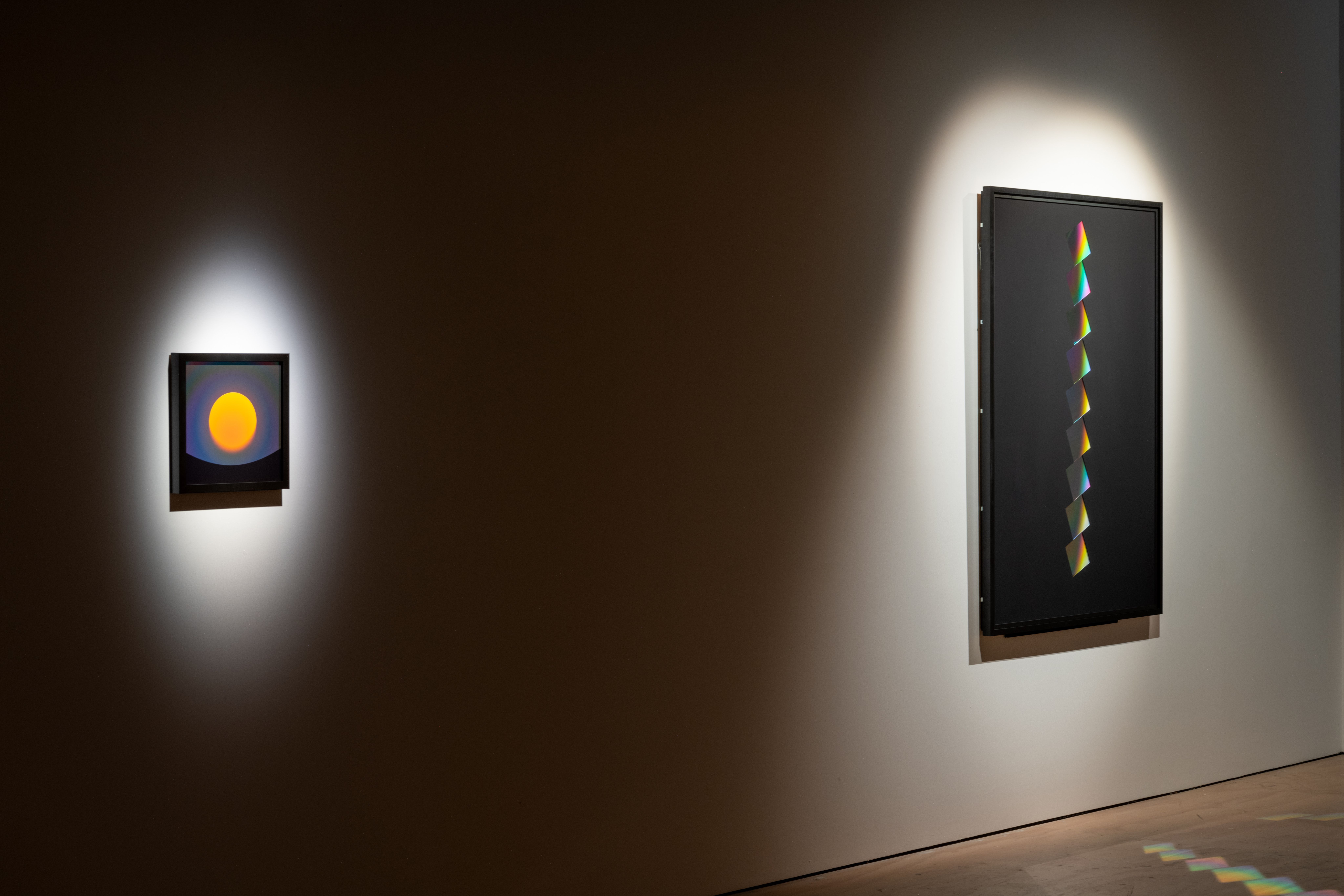 In Andrew Beck’s new works, iridescent titanium-coated glass panels glisten like the compound eyes of insects, their colour shifting as the viewer’s eye moves in relation to them. Insects’ eyes function as a series of independently operating light and colour sensors, giving them a wide field of view and the ability to perceive colours that lie outside the spectrum visible to humans and other mammals, such as ultraviolet frequencies. Beck’s work offers a twist on traditional abstraction, asking the viewer to consider the aesthetic qualities of light itself, and the tenuous, ephemeral visual effects created by its fleeting passage over the retina.