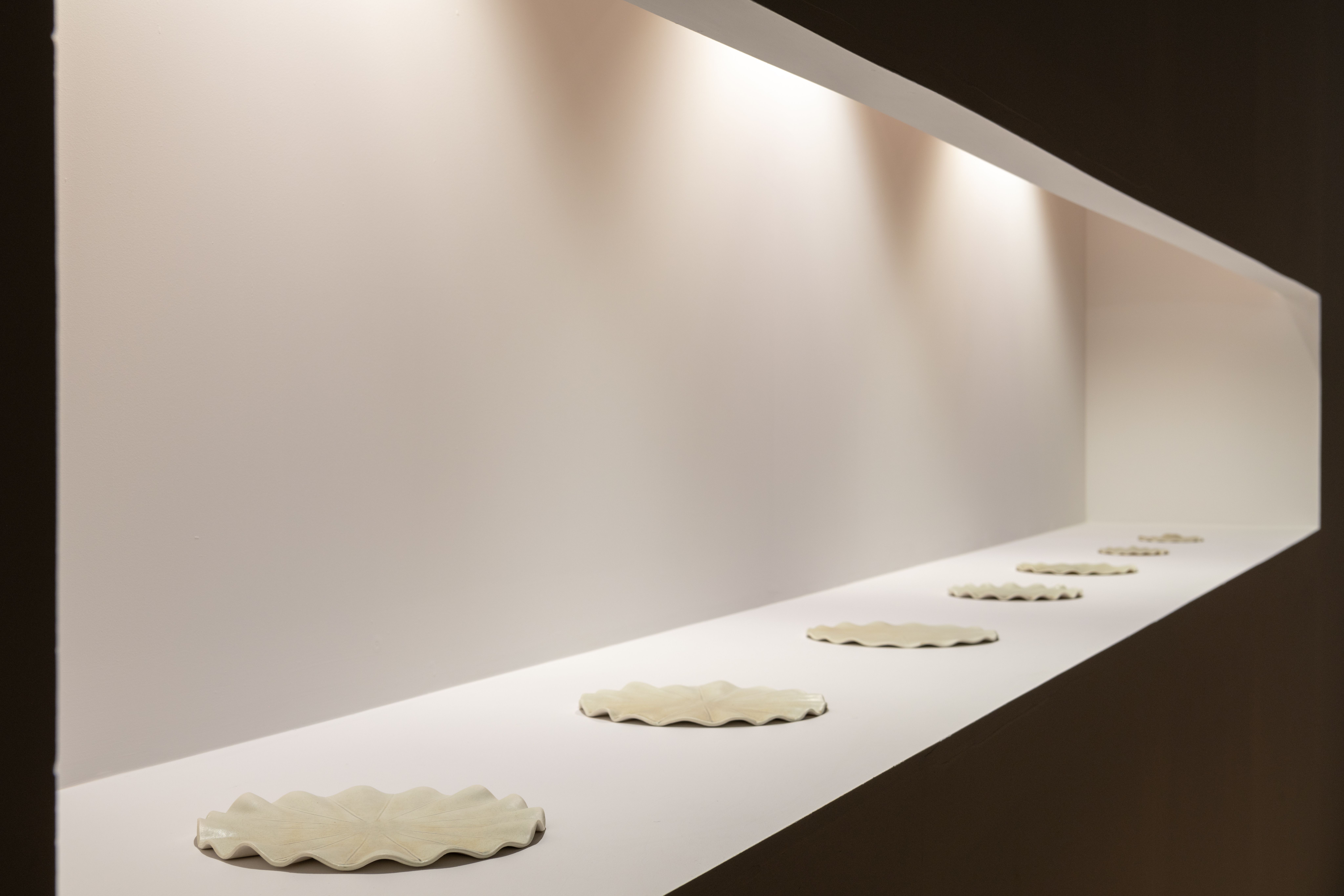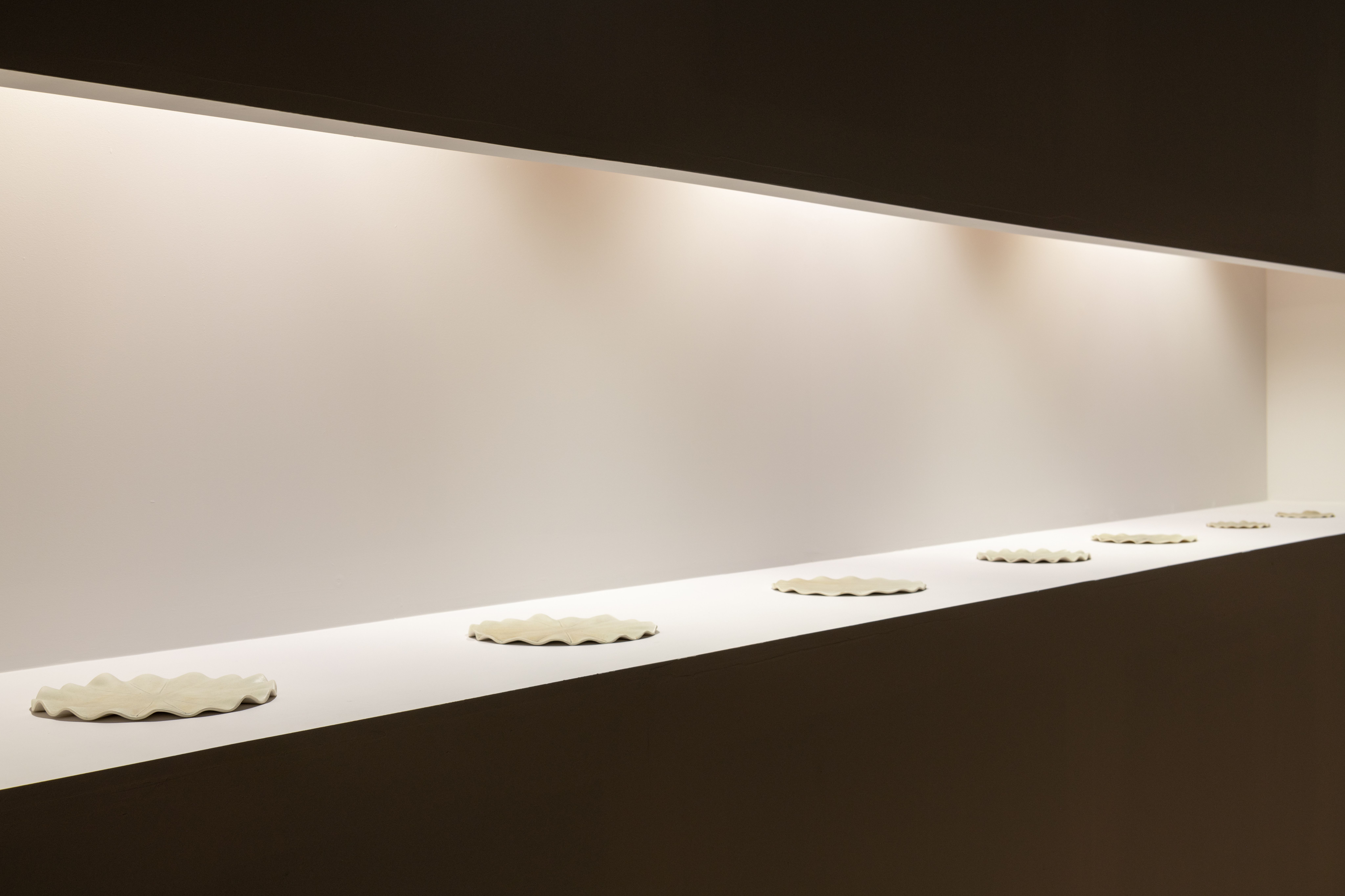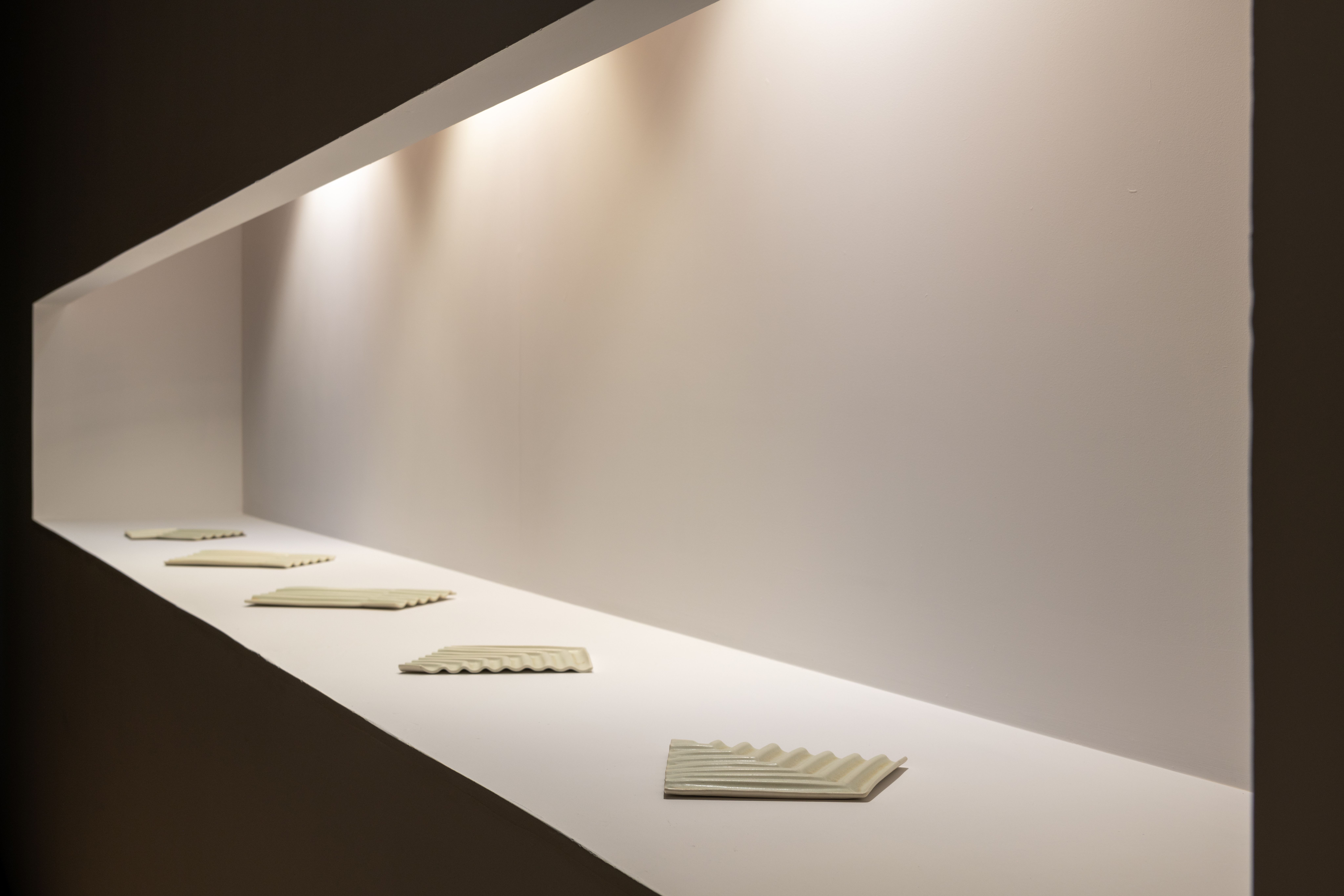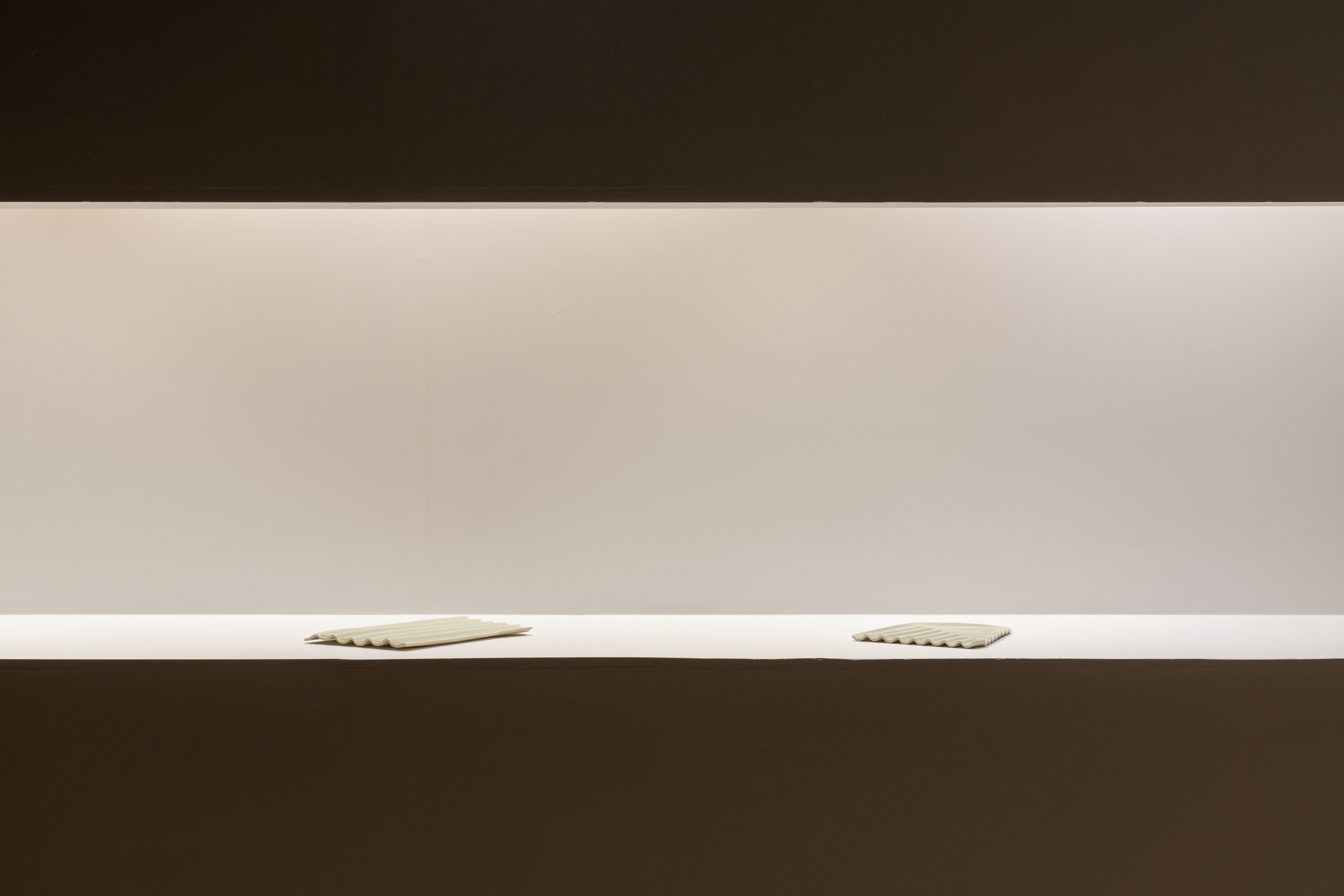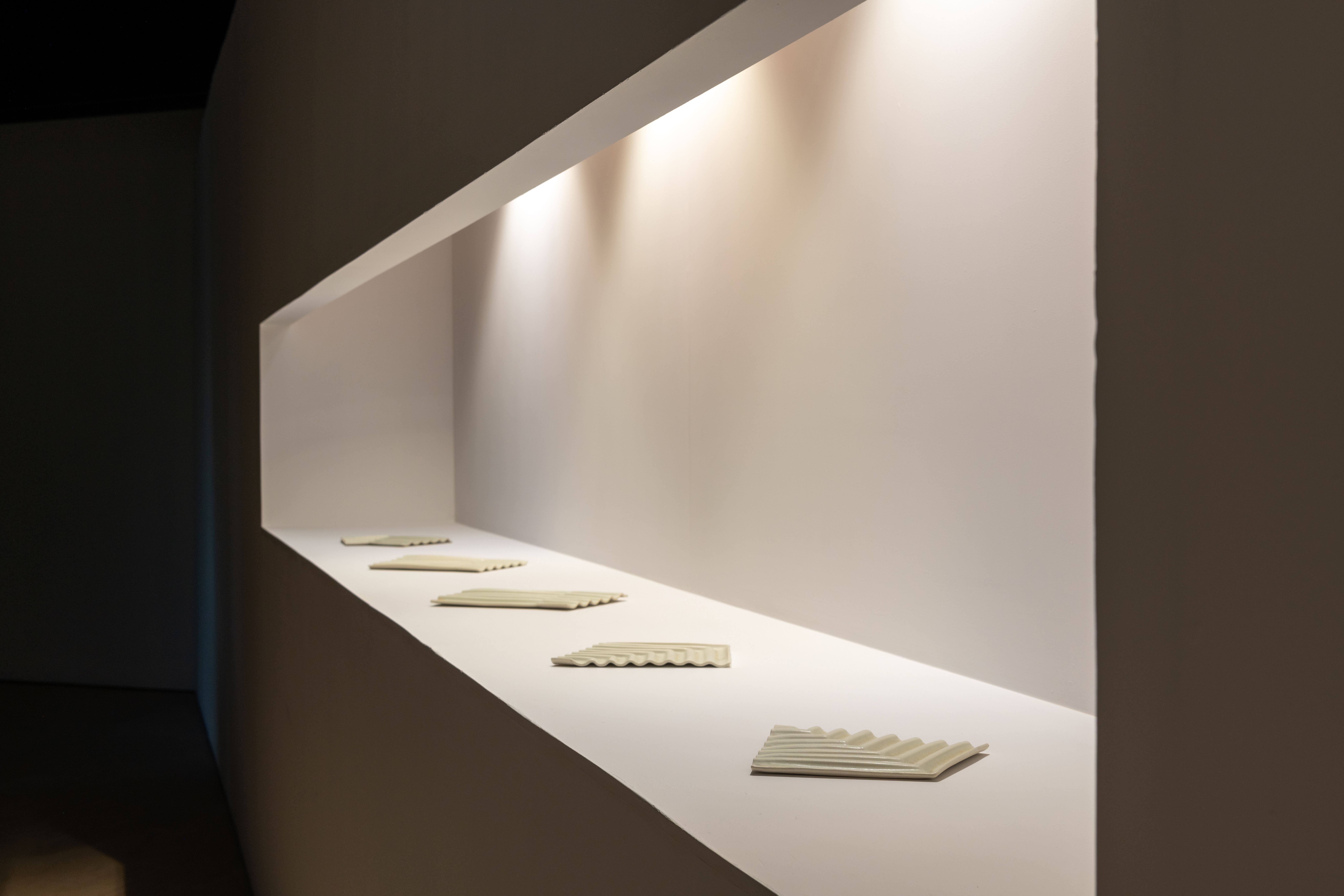 Lauren Winstone’s ceramics may seem an outlier in this group, but their regular, grooved and folded forms also reference the idea of frequency and repetition. The works have the feeling of physical manifestations of a rotational frequency, inanimate traces left behind by the intersection of some unknown oscillation and the potter’s hand. The ridges and folds of Winstone’s works also echo the peaks and valleys of an undulating waveform, their creamy solidity lending them the aspect of flotsam, shells cast ashore by the tides of light and sound found elsewhere in the exhibition.