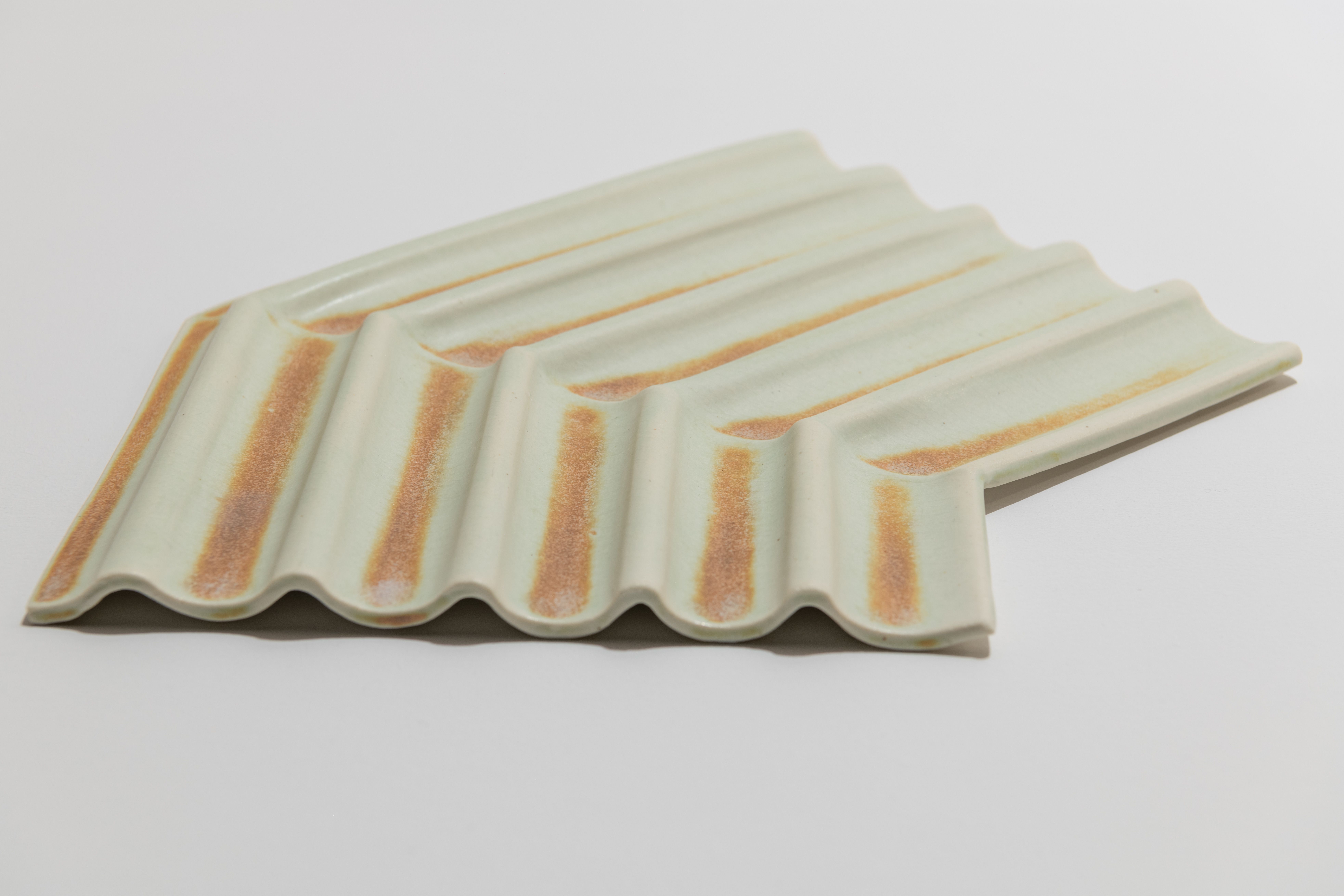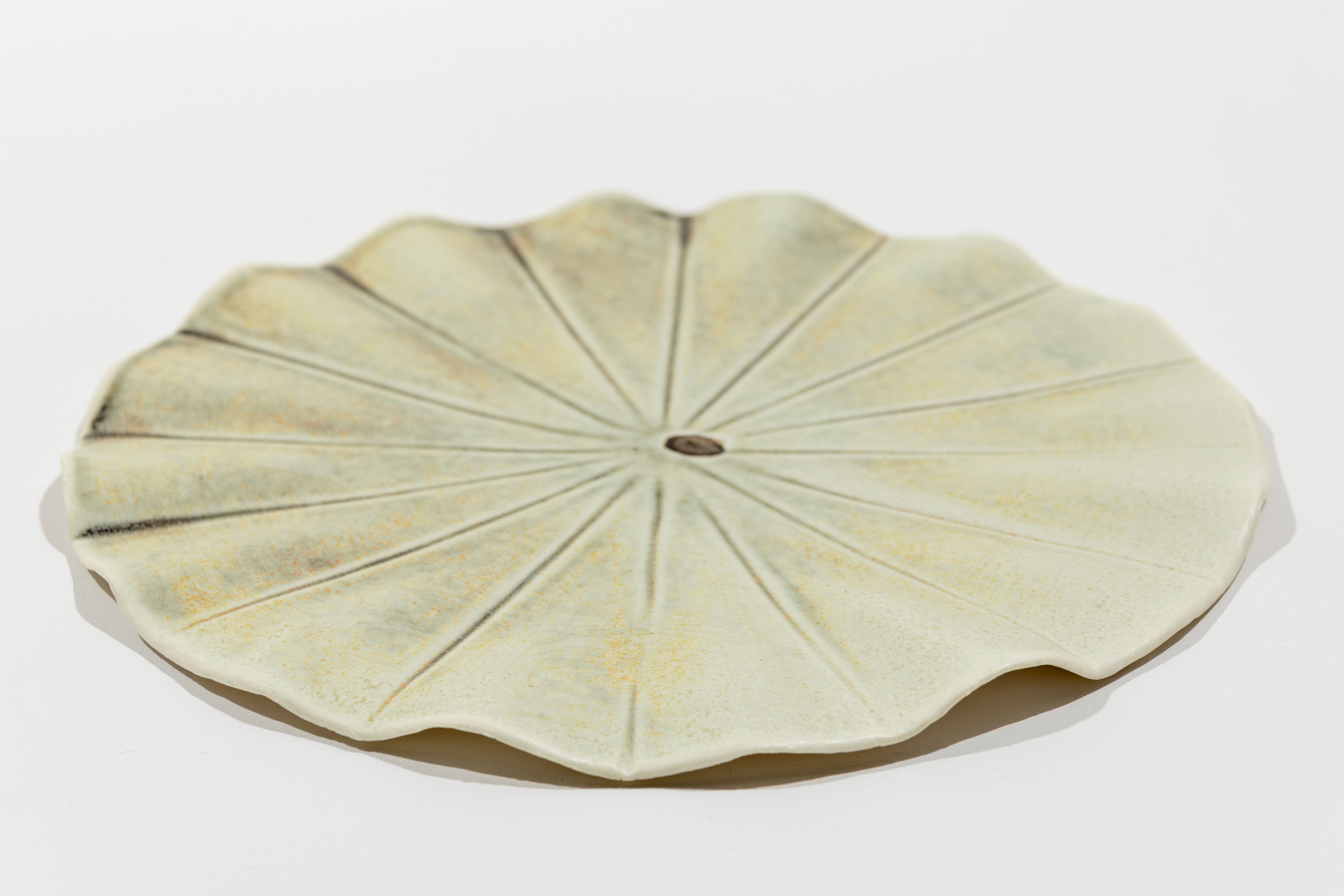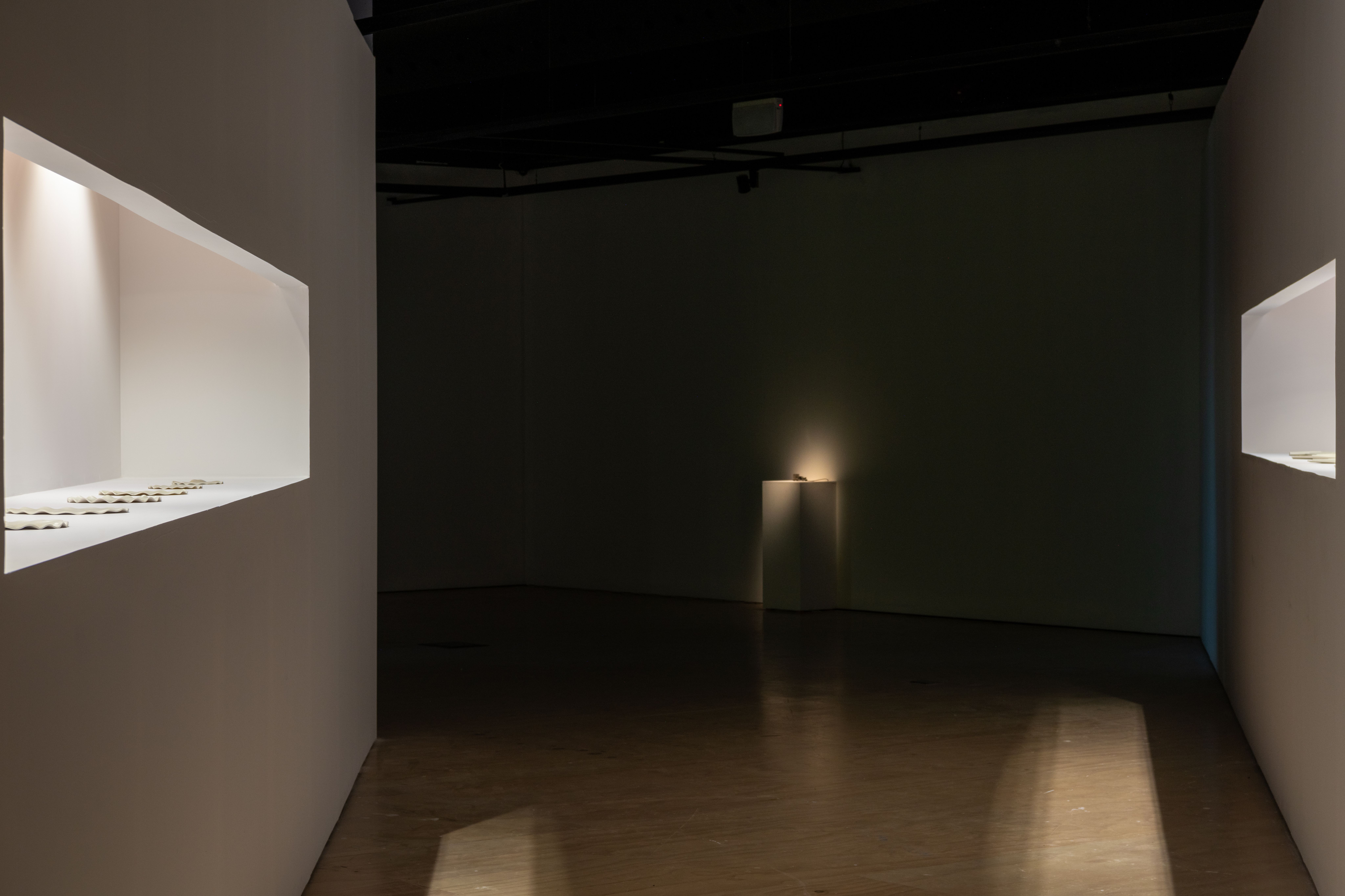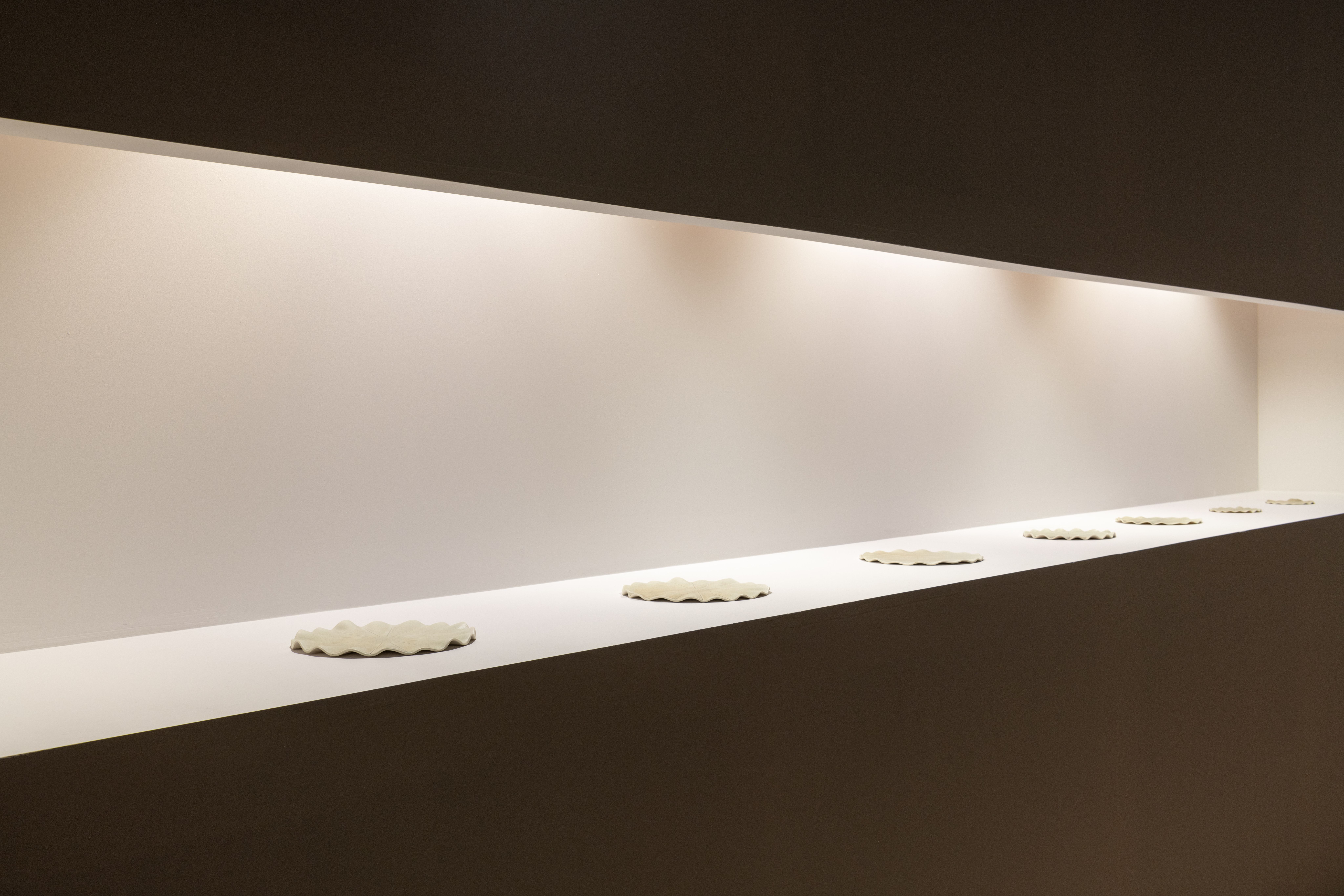 Lauren Winstone’s ceramics may seem an outlier in this group, but their regular, grooved and folded forms also reference the idea of frequency and repetition. The works have the feeling of physical manifestations of a rotational frequency, inanimate traces left behind by the intersection of some unknown oscillation and the potter’s hand. The ridges and folds of Winstone’s works also echo the peaks and valleys of an undulating waveform, their creamy solidity lending them the aspect of flotsam, shells cast ashore by the tides of light and sound found elsewhere in the exhibition.