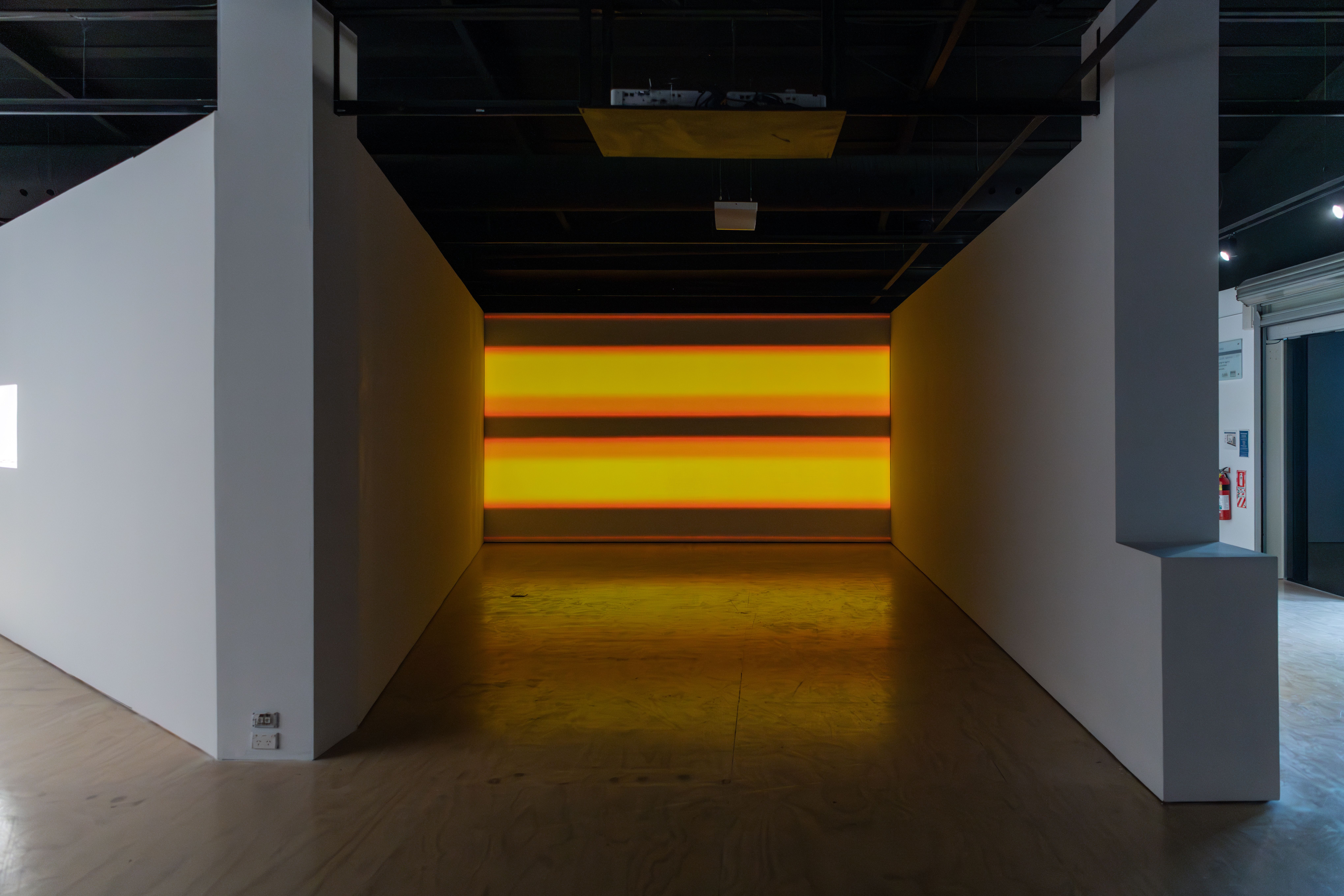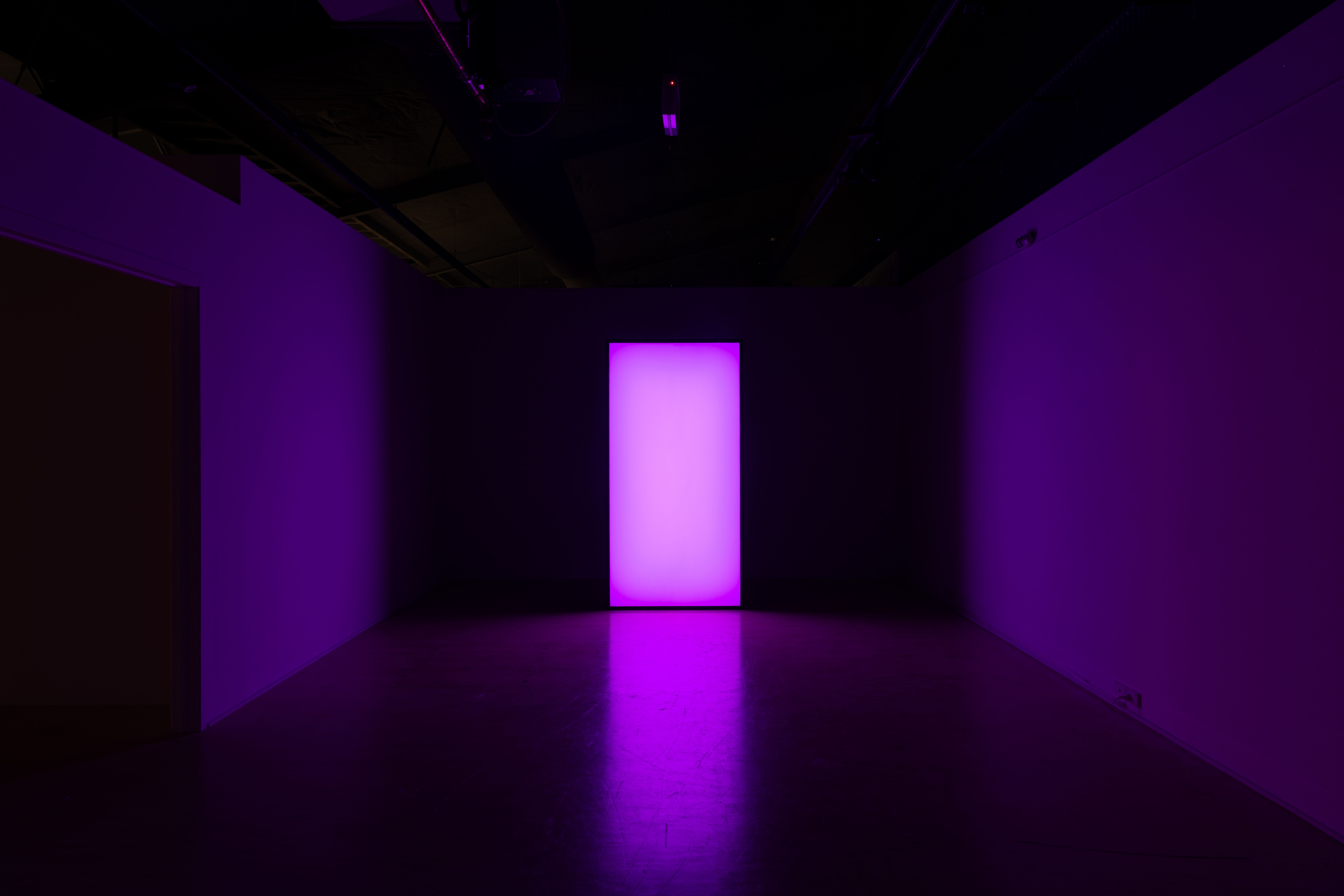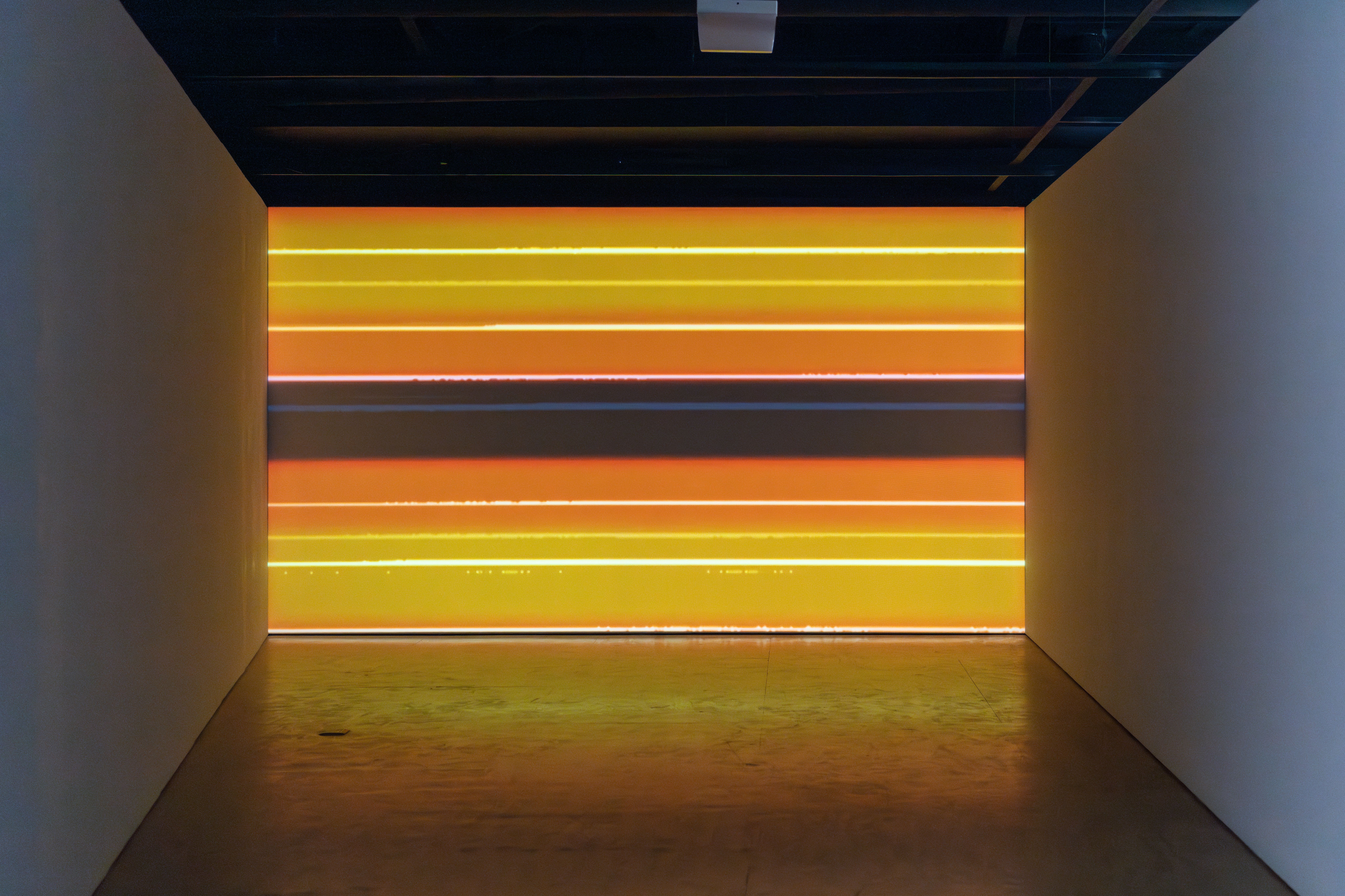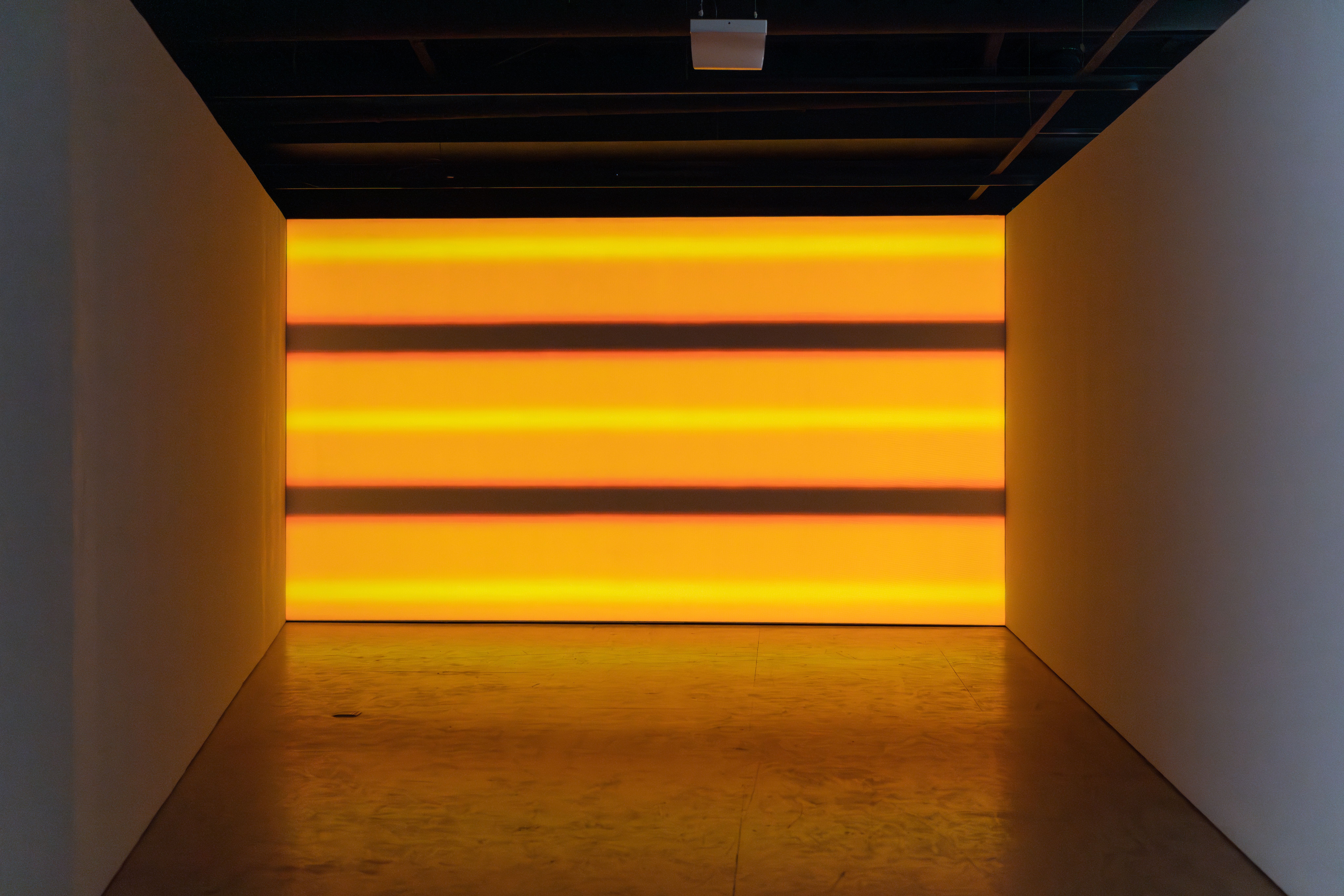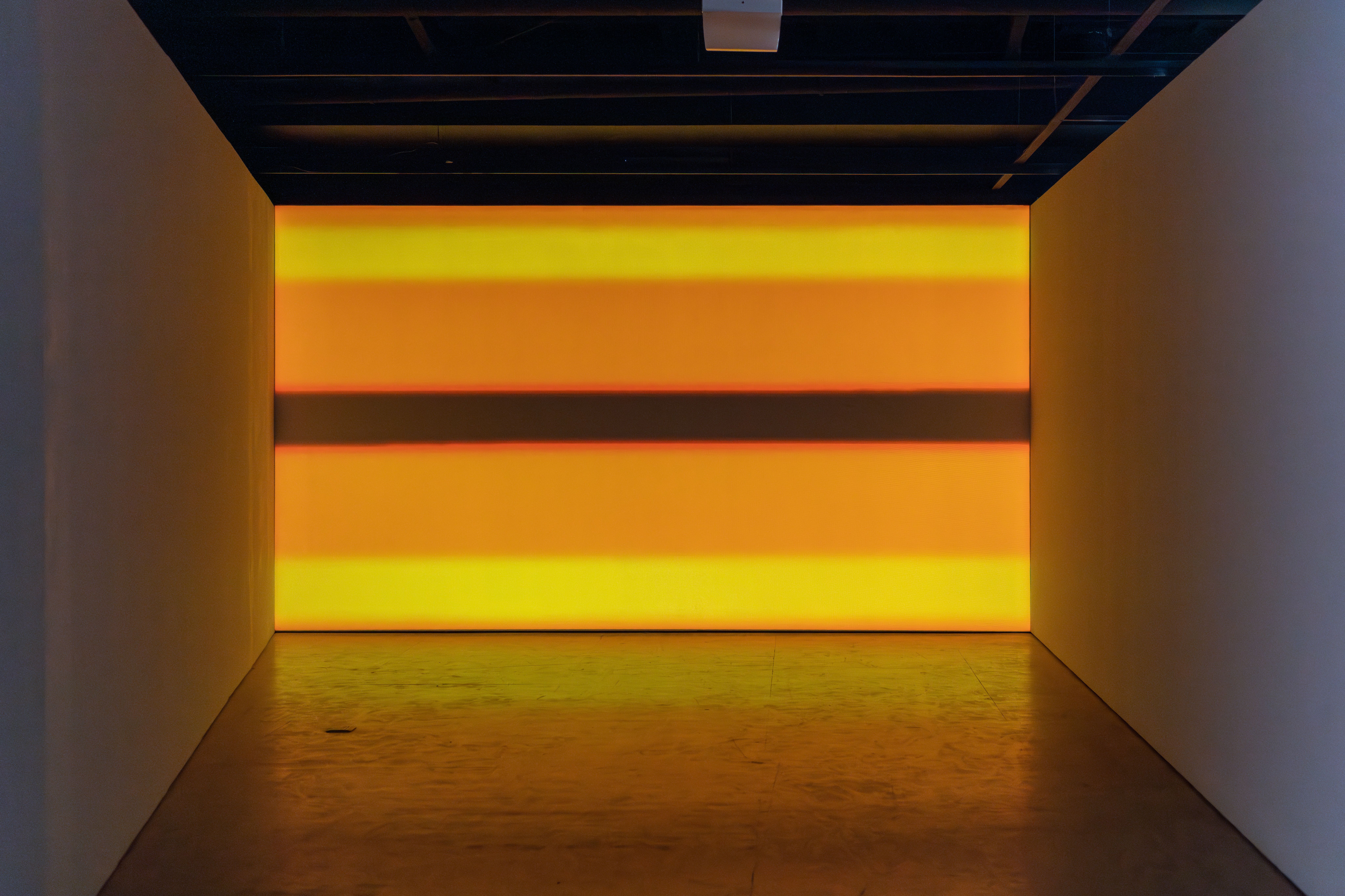 In LIGHT-HAUS, by Tyler Jackson and Jackie Jenkins, a monolithic screen bathes the room in swathes of ever-changing coloured light, while the industrial drones, hums and high-frequency vibrations of Jenkins’ soundtrack constantly threaten to push the experience over the edge into complete sensory overload. A response to the ideas set forth in Bauhaus designer Herbert Bayer’s 1924-5 work Design for a Cinema, LIGHT-HAUS is also a viscerally synaesthetic immersion in a thrumming pool of colour and soundwaves.