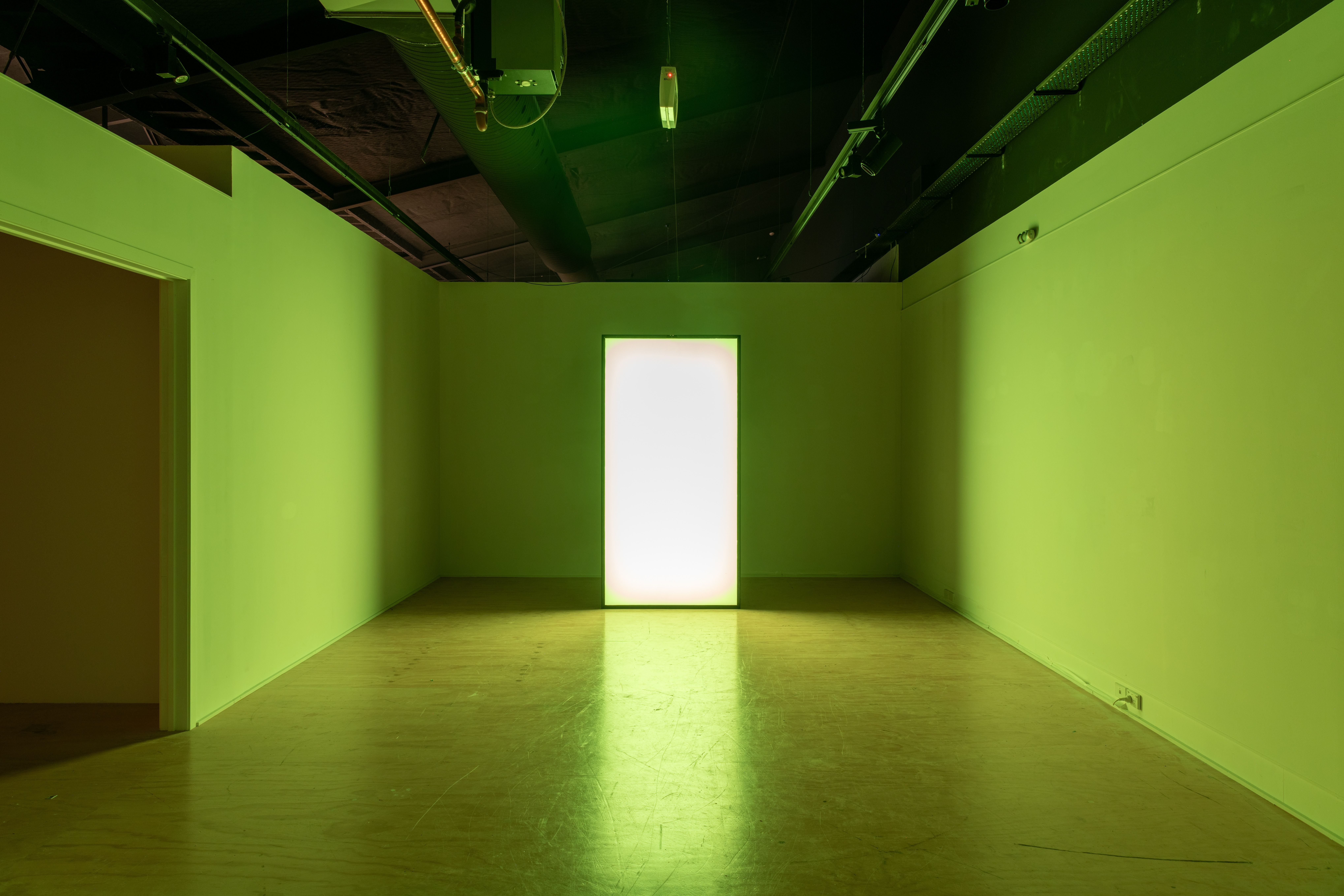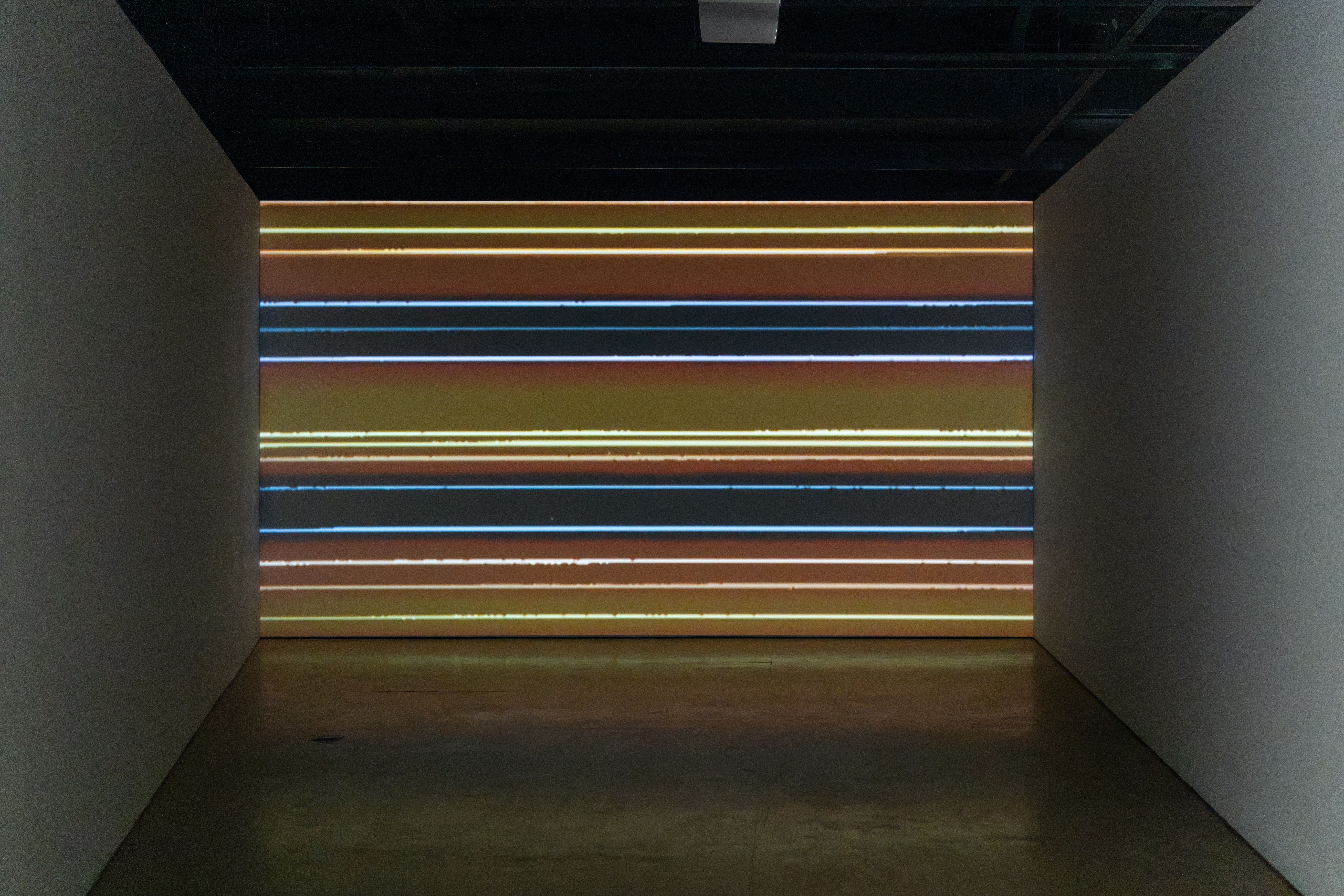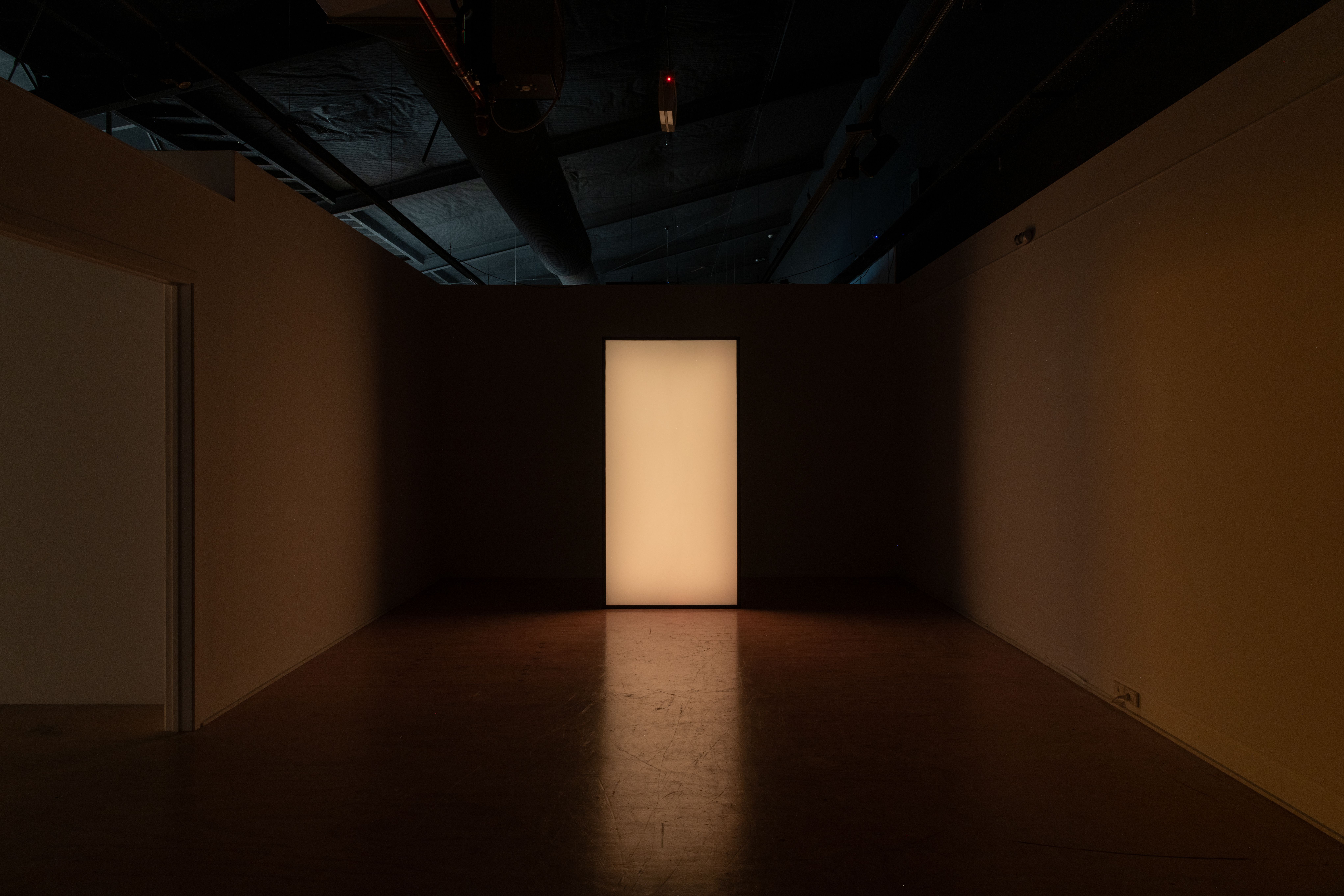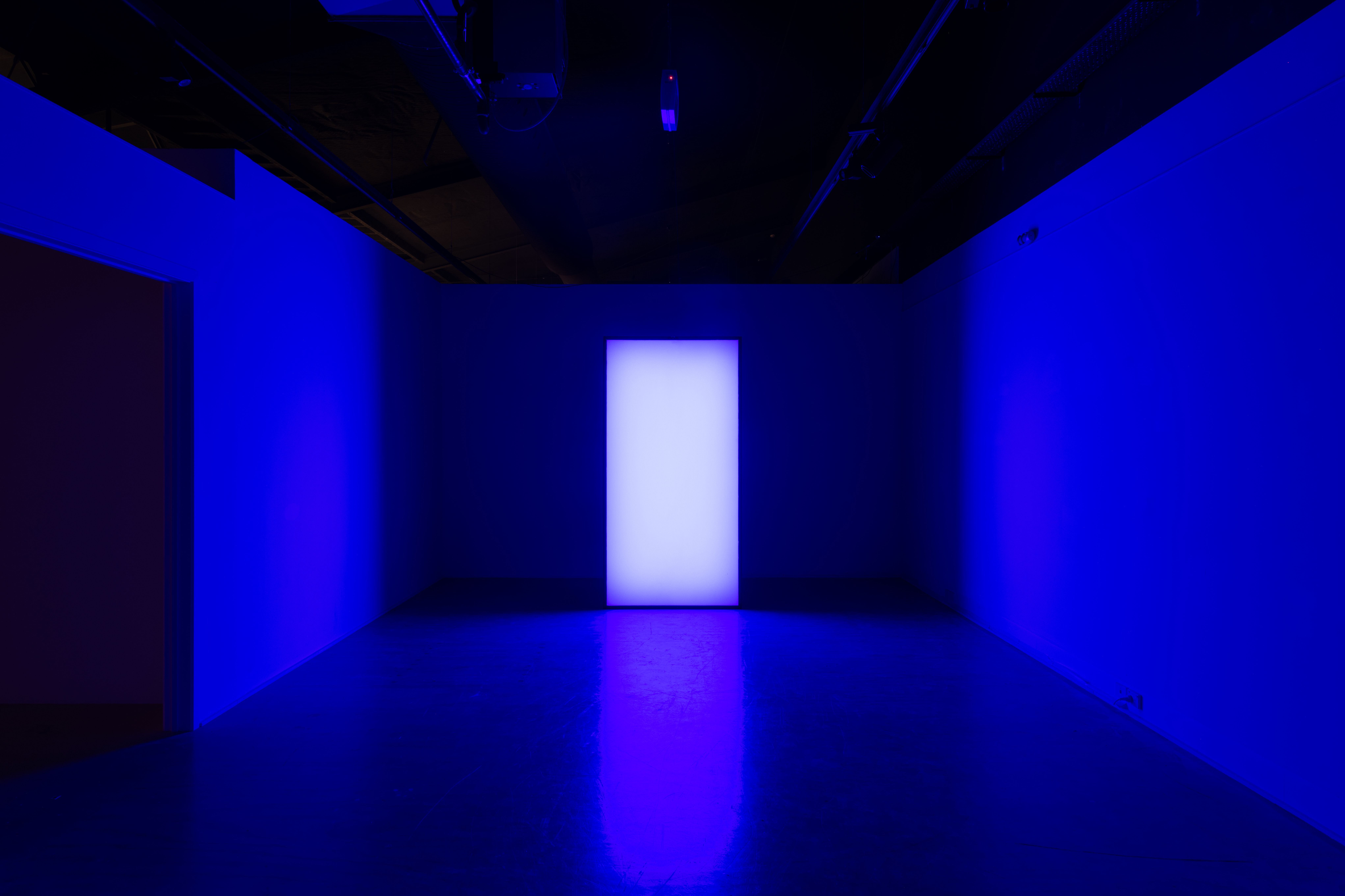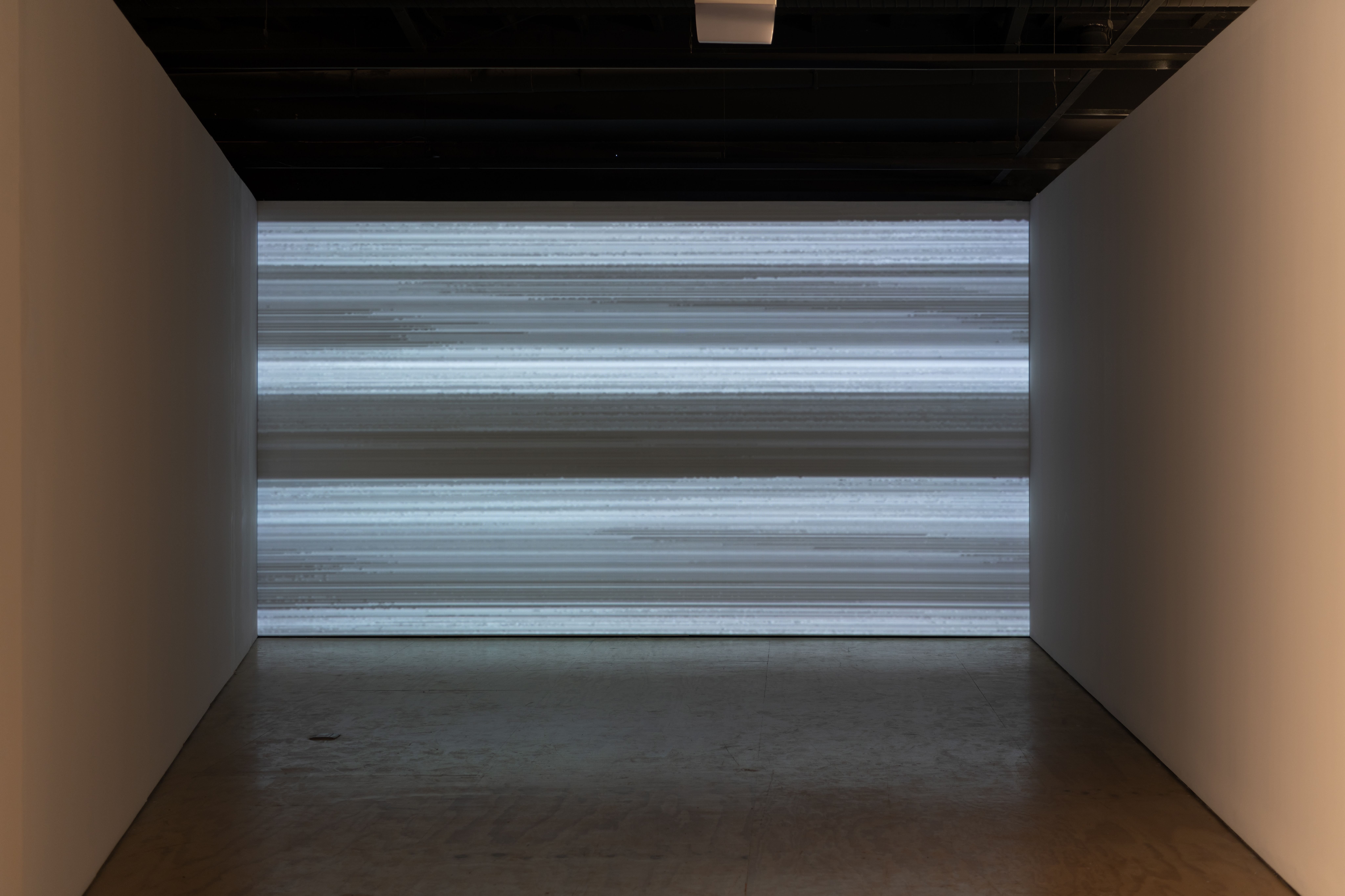 In LIGHT-HAUS, by Tyler Jackson and Jackie Jenkins, a monolithic screen bathes the room in swathes of ever-changing coloured light, while the industrial drones, hums and high-frequency vibrations of Jenkins’ soundtrack constantly threaten to push the experience over the edge into complete sensory overload. A response to the ideas set forth in Bauhaus designer Herbert Bayer’s 1924-5 work Design for a Cinema, LIGHT-HAUS is also a viscerally synaesthetic immersion in a thrumming pool of colour and soundwaves.