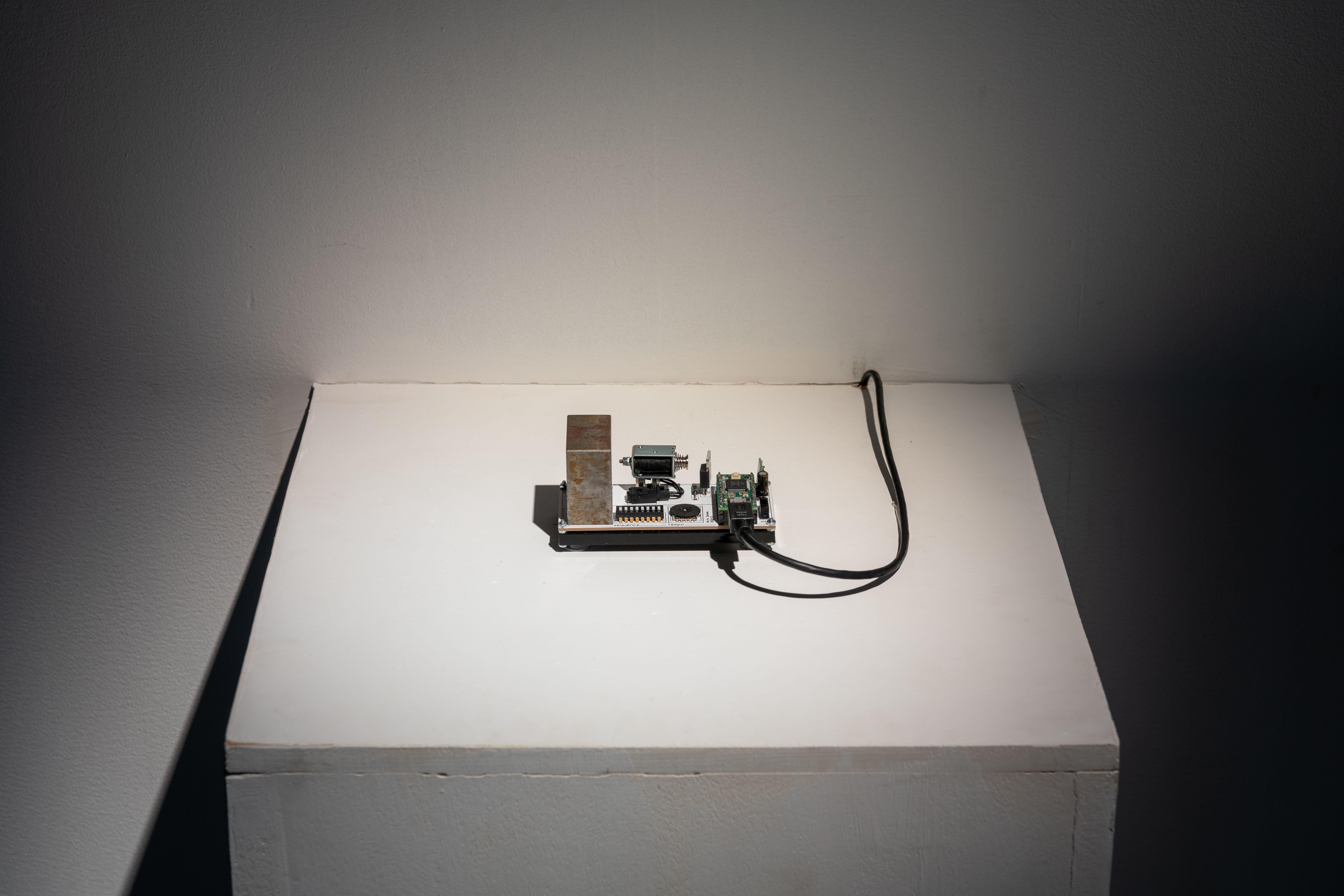 Mo H. Zareei’s Material Sequencer is an electromechanical sound-sculpture designed to emphasise the physical materiality of sound. The work re-investigates one of the most elemental tools of electronic music production, an 8-step rhythmic sequence, by removing the sequencing process from its black box and instead flaunting its materiality. All the interface components are presented on a custom-designed circuit board that is fully exposed, with a bank of eight small switches and an on-board dial for entering a rhythmic pattern and modifying its rate. Using a microcontroller, the patterns are converted into a series of electrical impulses that are then used to actuate a solenoid, which in turn strikes a block of solid matter to generate sound.