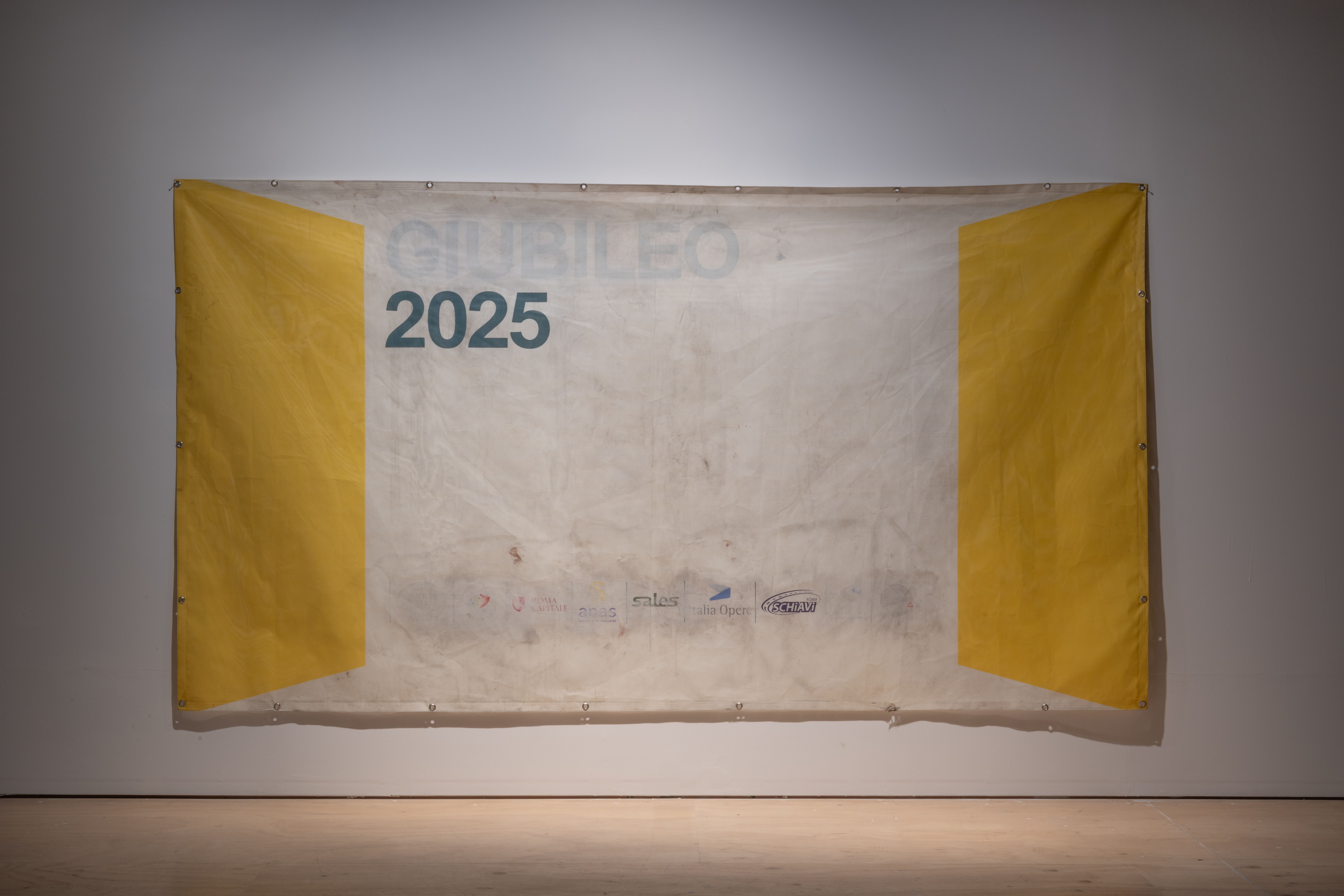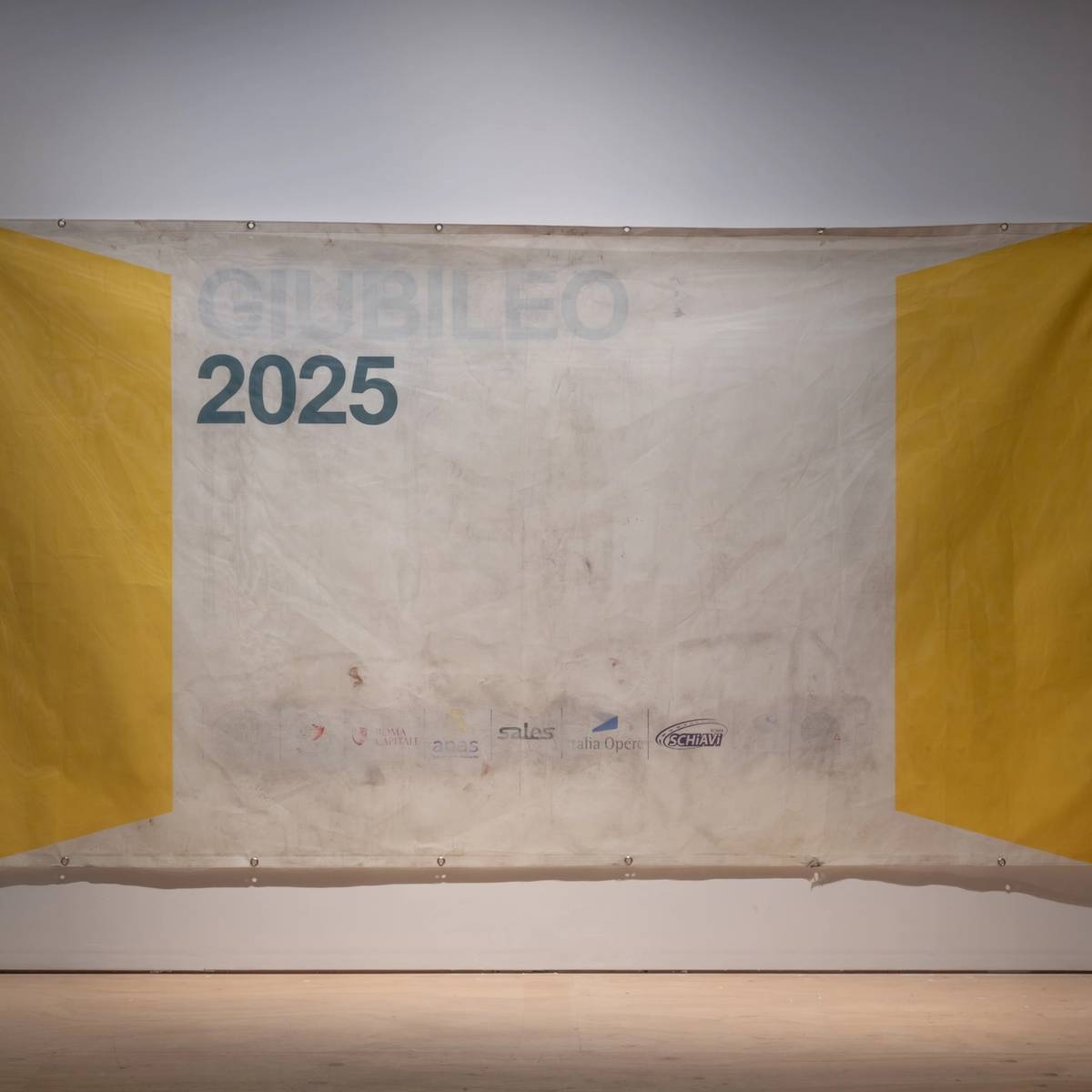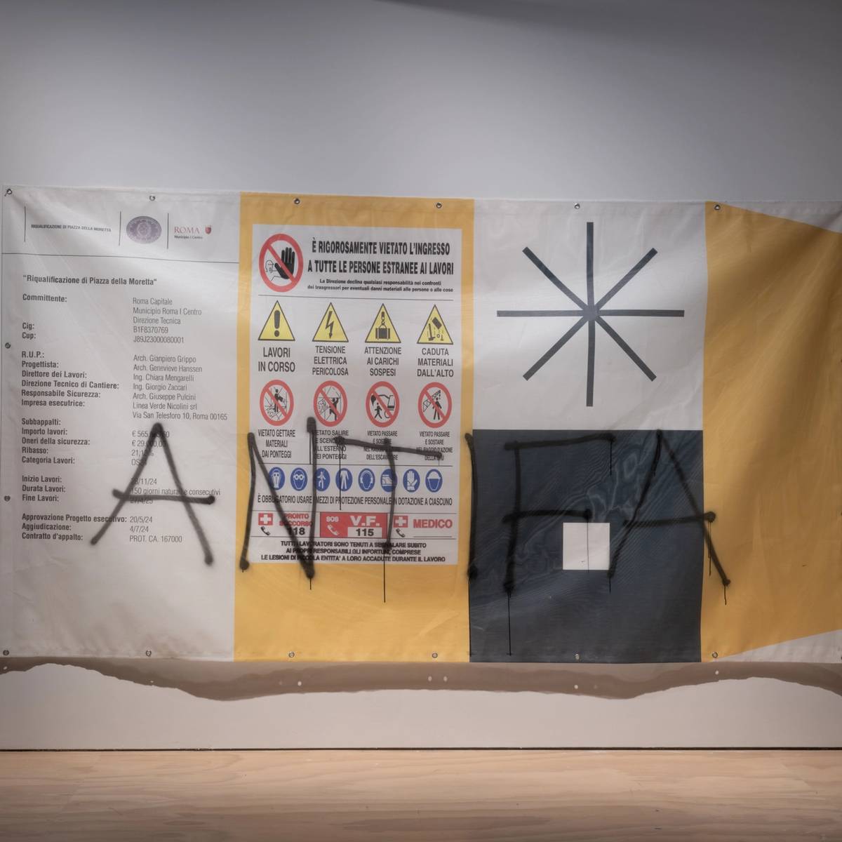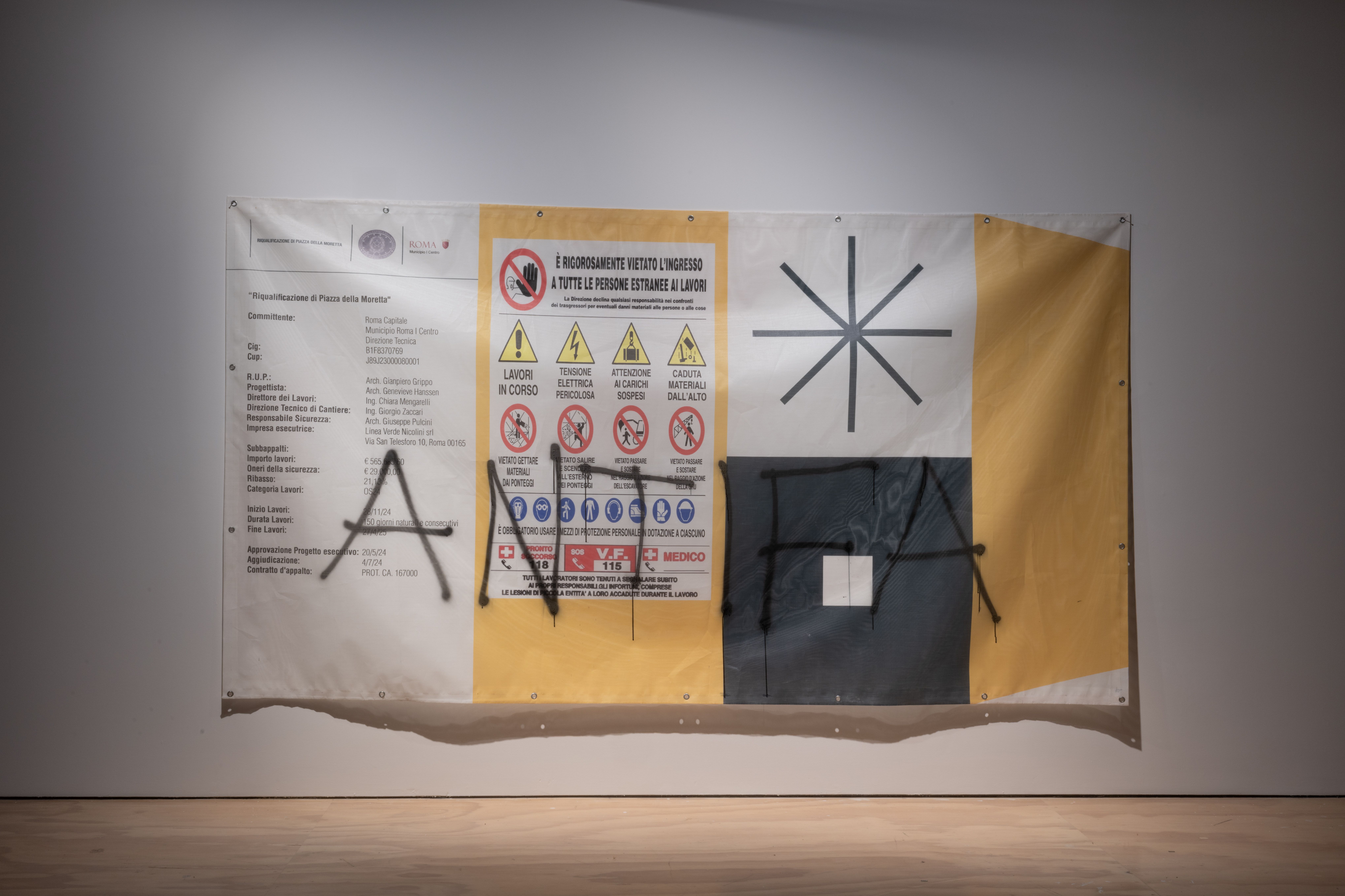 In Broken World, Alex Chalmers (b. 1991, Whangārei) offers a nuanced meditation on the impermanence of power, using found objects to explore cycles of dominance and decline. The phrase “caput mundi” (meaning “head of the world”) serves as a conceptual anchor for the work, drawn directly from the branding displayed on construction hoardings across Rome, the source of the discarded materials used in this exhibition. Originally a declaration of the city's historic centrality, this phrase now exists in a liminal state, printed on temporary barriers that both conceal and advertise the city’s transformation. Chalmers highlights the tension between Rome’s imperial legacy and its present-day reality as a site of perpetual reconstruction, gesturing toward the broader human impulse to build, conquer, and endure. His transformation of “caput” into “kaput” (a colloquialism for “broken”) subtly reframes the narrative, not as a simple critique of Rome’s legacy, but as an inquiry into the fragility of all systems of authority, past and present.