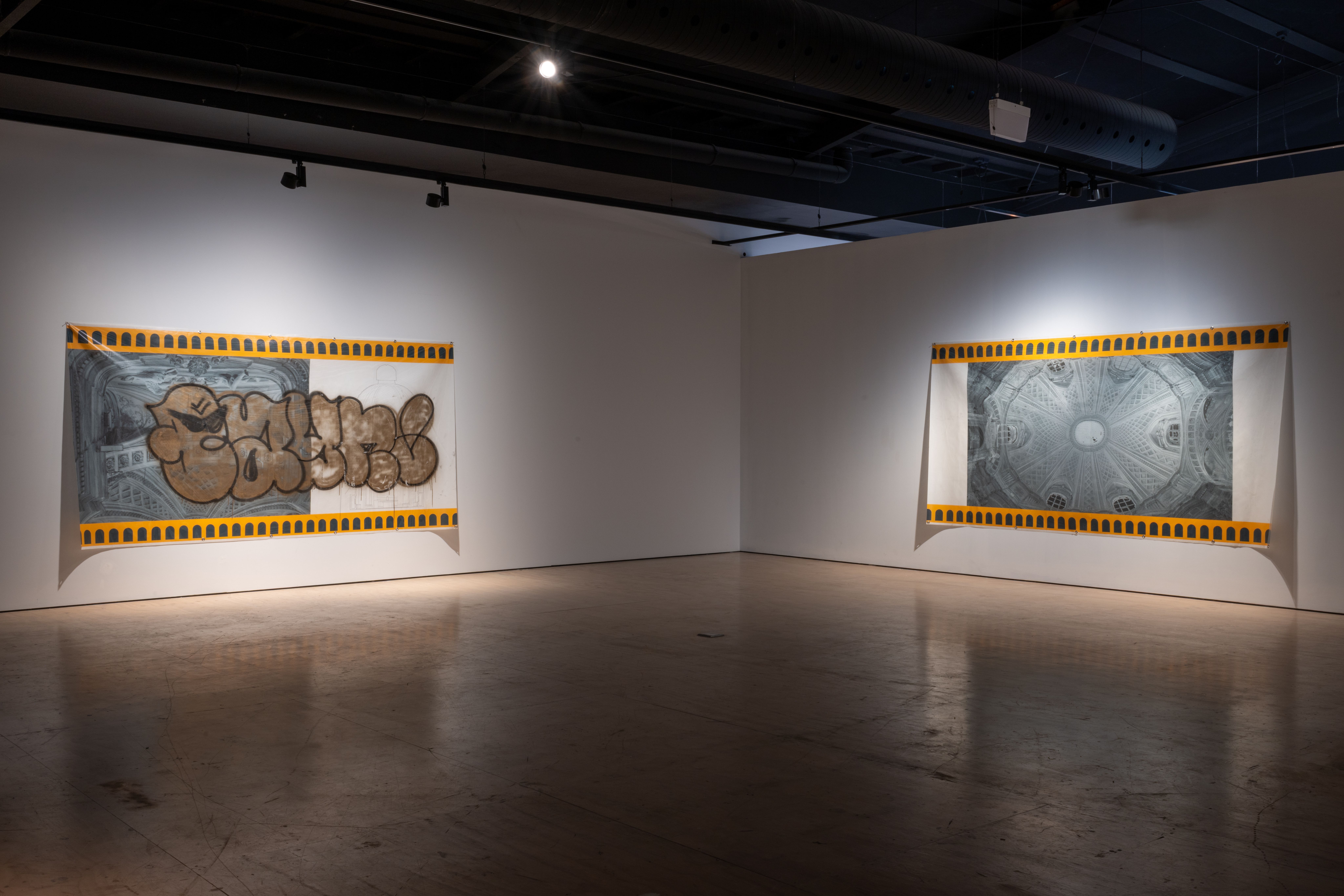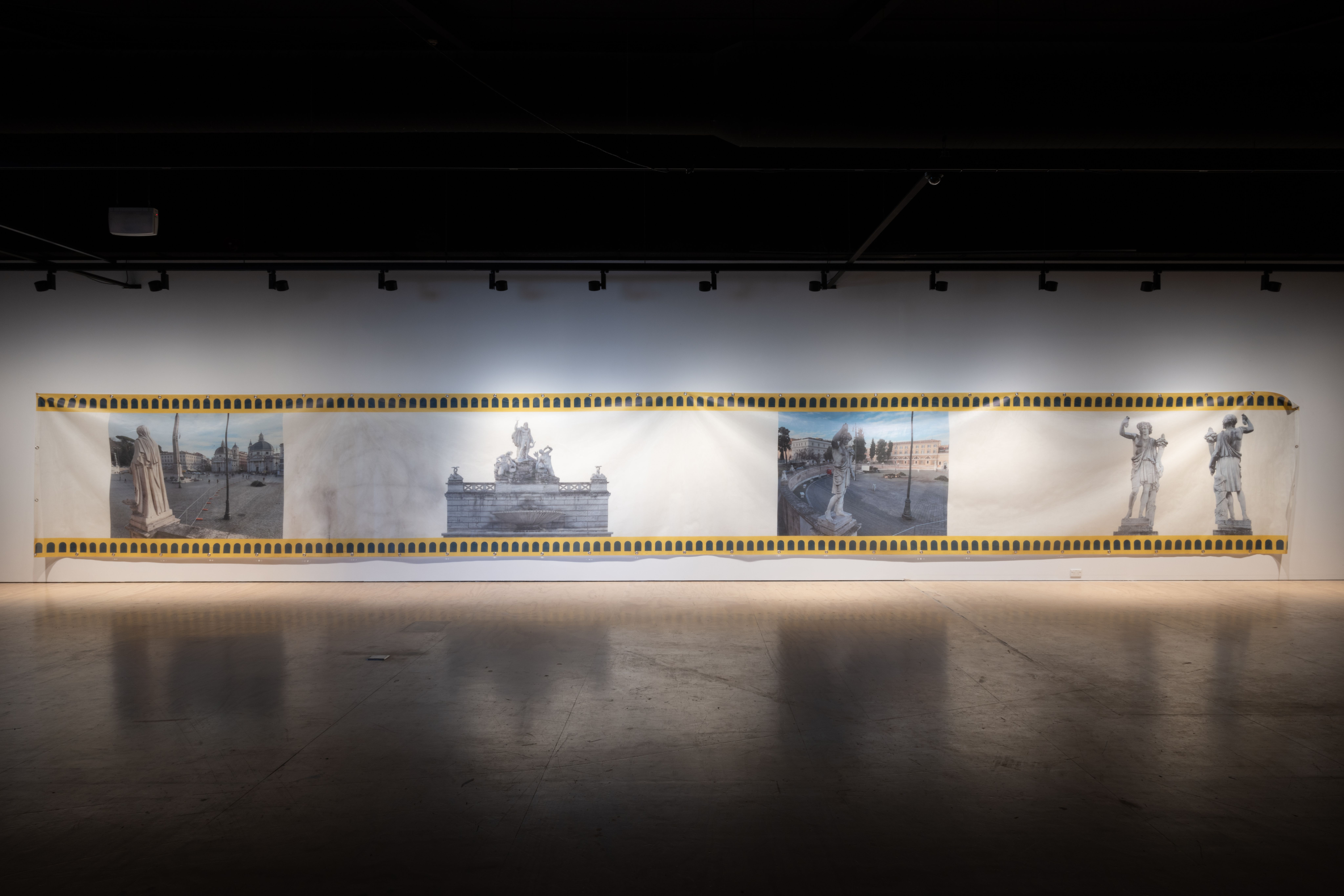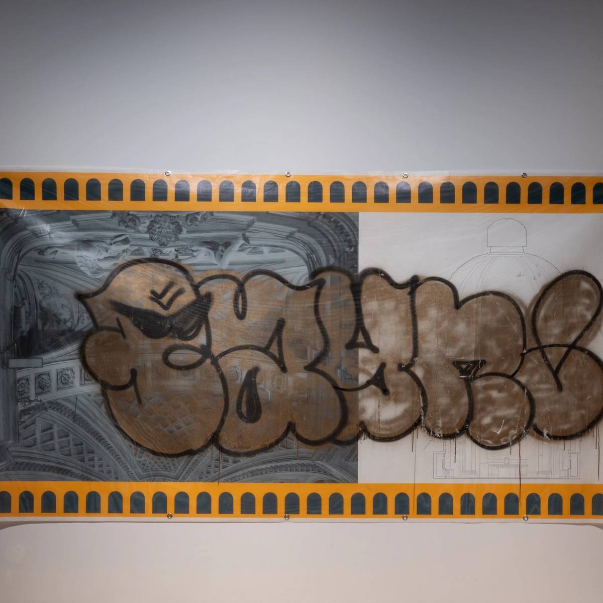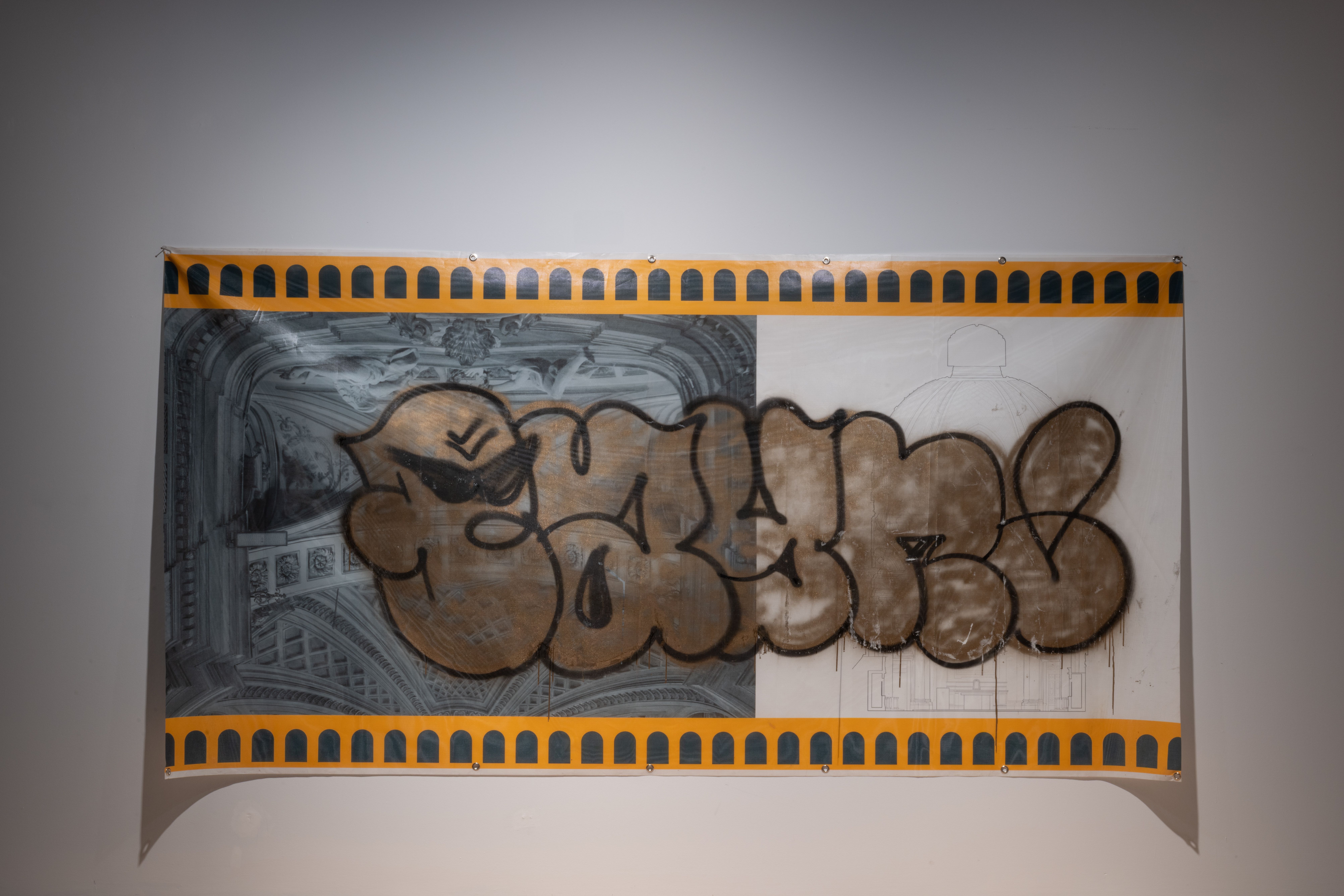In Broken World, Alex Chalmers (b. 1991, Whangārei) offers a nuanced meditation on the impermanence of power, using found objects to explore cycles of dominance and decline. The phrase “caput mundi” (meaning “head of the world”) serves as a conceptual anchor for the work, drawn directly from the branding displayed on construction hoardings across Rome, the source of the discarded materials used in this exhibition. Originally a declaration of the city's historic centrality, this phrase now exists in a liminal state, printed on temporary barriers that both conceal and advertise the city’s transformation. Chalmers highlights the tension between Rome’s imperial legacy and its present-day reality as a site of perpetual reconstruction, gesturing toward the broader human impulse to build, conquer, and endure. His transformation of “caput” into “kaput” (a colloquialism for “broken”) subtly reframes the narrative, not as a simple critique of Rome’s legacy, but as an inquiry into the fragility of all systems of authority, past and present.