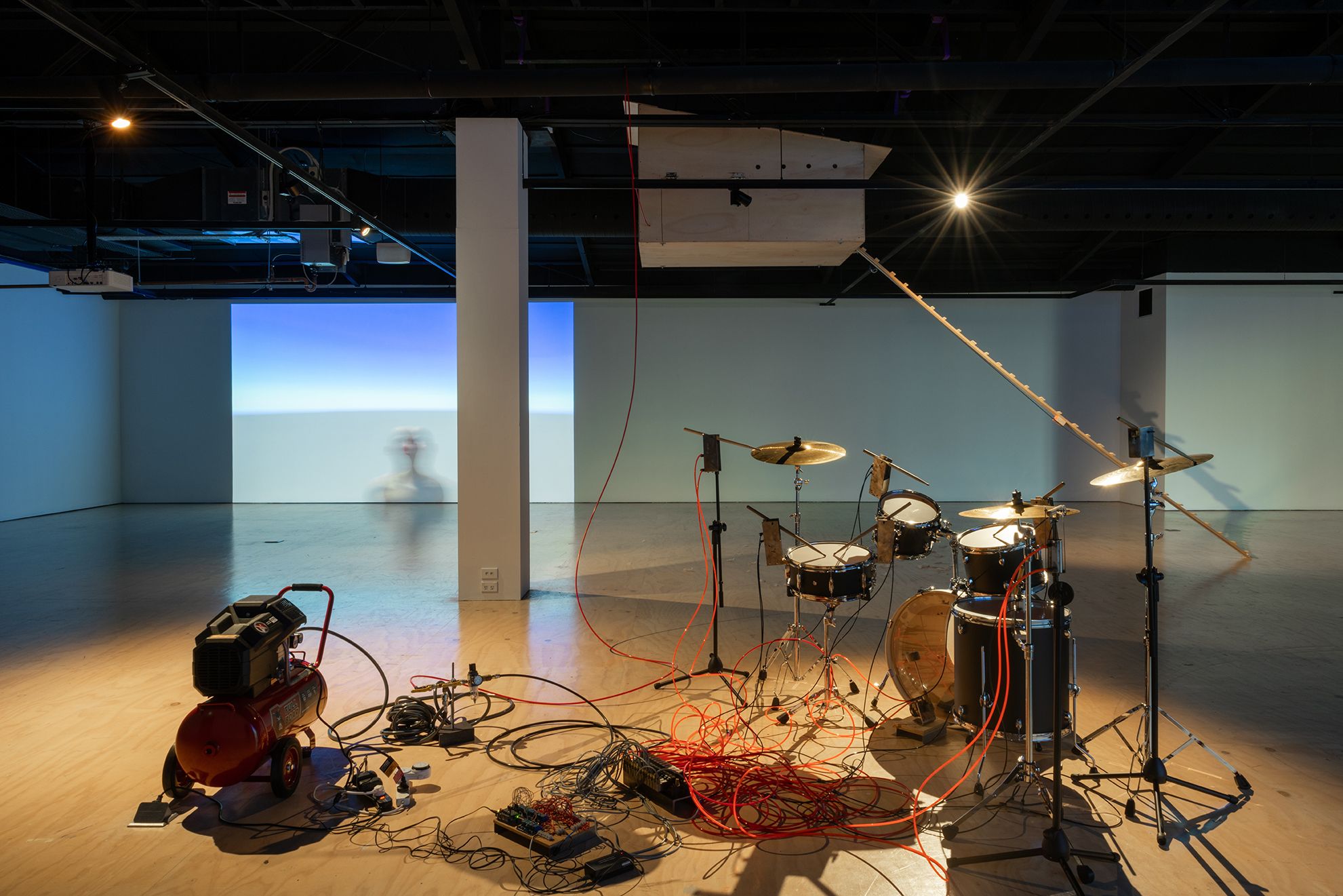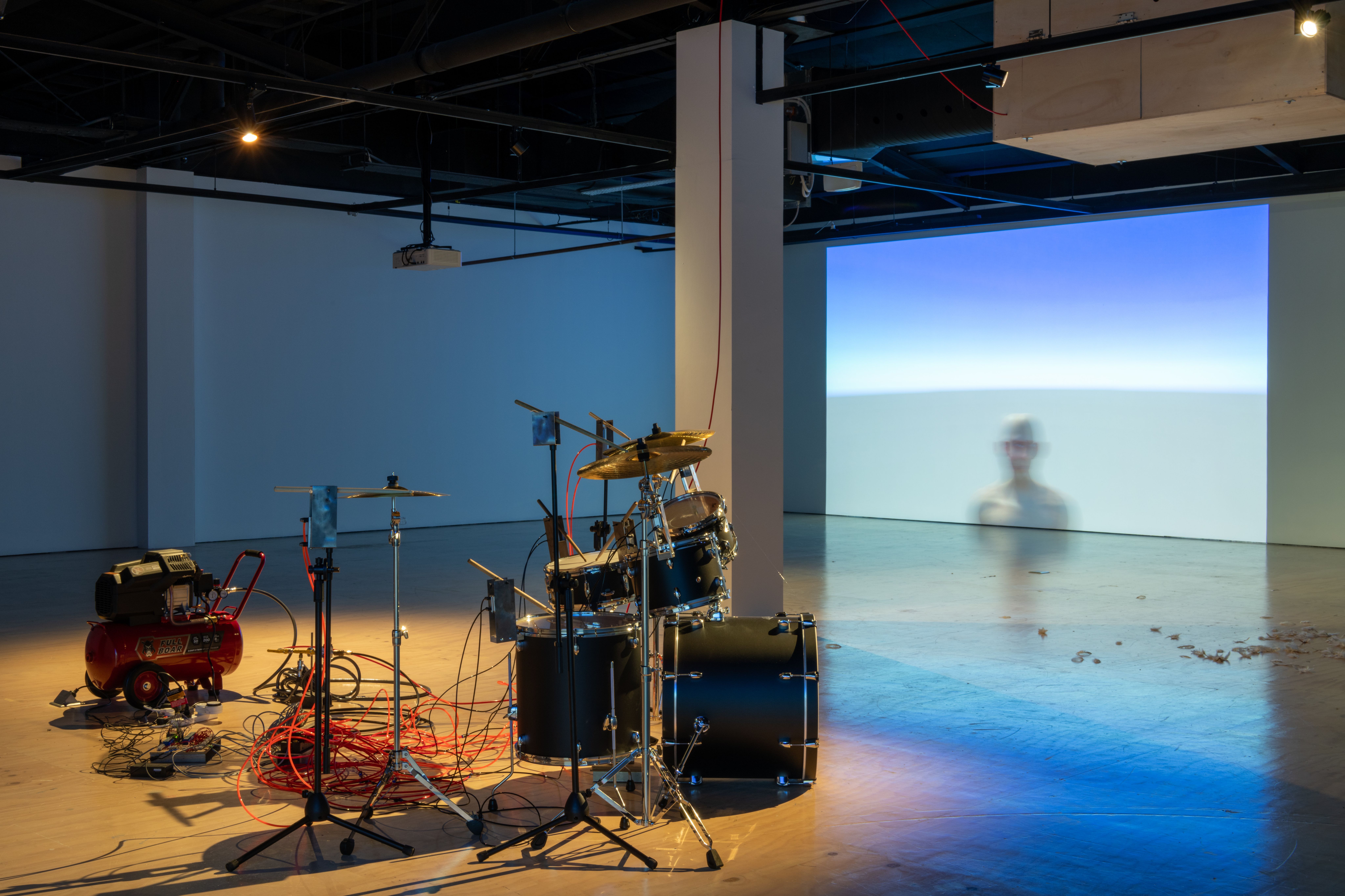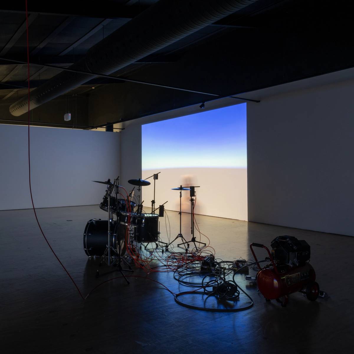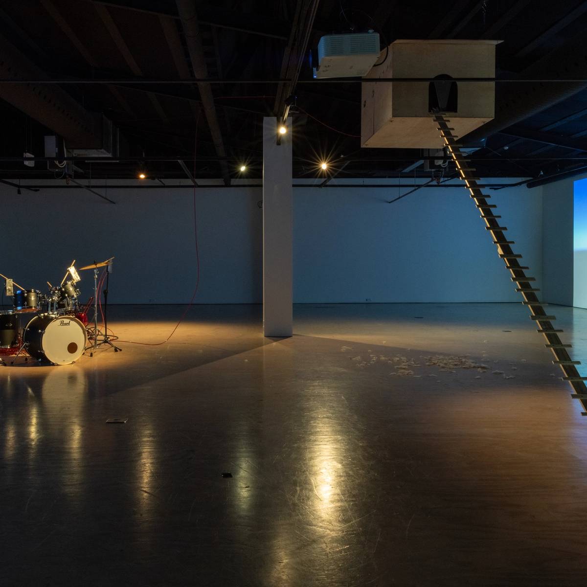 Welcome to Sean Kerr's exhibition - a convoluted playground of sounds, sights, and mischief. Here, observe a plywood henhouse, suspended eerily in a black abyss above your heads \u2013 a cheeky provocateur that dispenses feathers amidst echoes of clucks. Near the centre, an air compressor grumbles, powering the unruly machinery that Kerr is known for: notably, a self-playing drumkit drumming to an unheard rhythm. Two uncanny AI avatars, hairless, naked males, converse, sing, and dance in an otherworldly spectacle. \\n\\nKerr's work draws heavily on elusive communication theory, sprinkled with dashes of slapstick comedy, probing deep into the murky underbelly of social and technological interfaces. Much like his previous works, this exhibition could be seen as an observation on the chaotic realities of life itself, or perhaps a satirical jab at our futile attempts to control the uncontrollable. \\n\\nSean Kerr - a master of disarray, an orchestrator of the absurd. His creations occupy a curious space, perched precariously between reality and hyperreality, forcing his spectators to question the normalcy of their quotidian interactions. Constantly pushing boundaries, he melds the mechanical with the theatrical, creating an immersive experience teetering on the brink of the comically dystopian. The show will surely leave you pondering long after you've left the gallery's confines. \\n\\nRemember, the artist loves to keep us guessing, perhaps we are all part of his mischievous engagement, perpetually caught in the crossfire of his relentless machines.