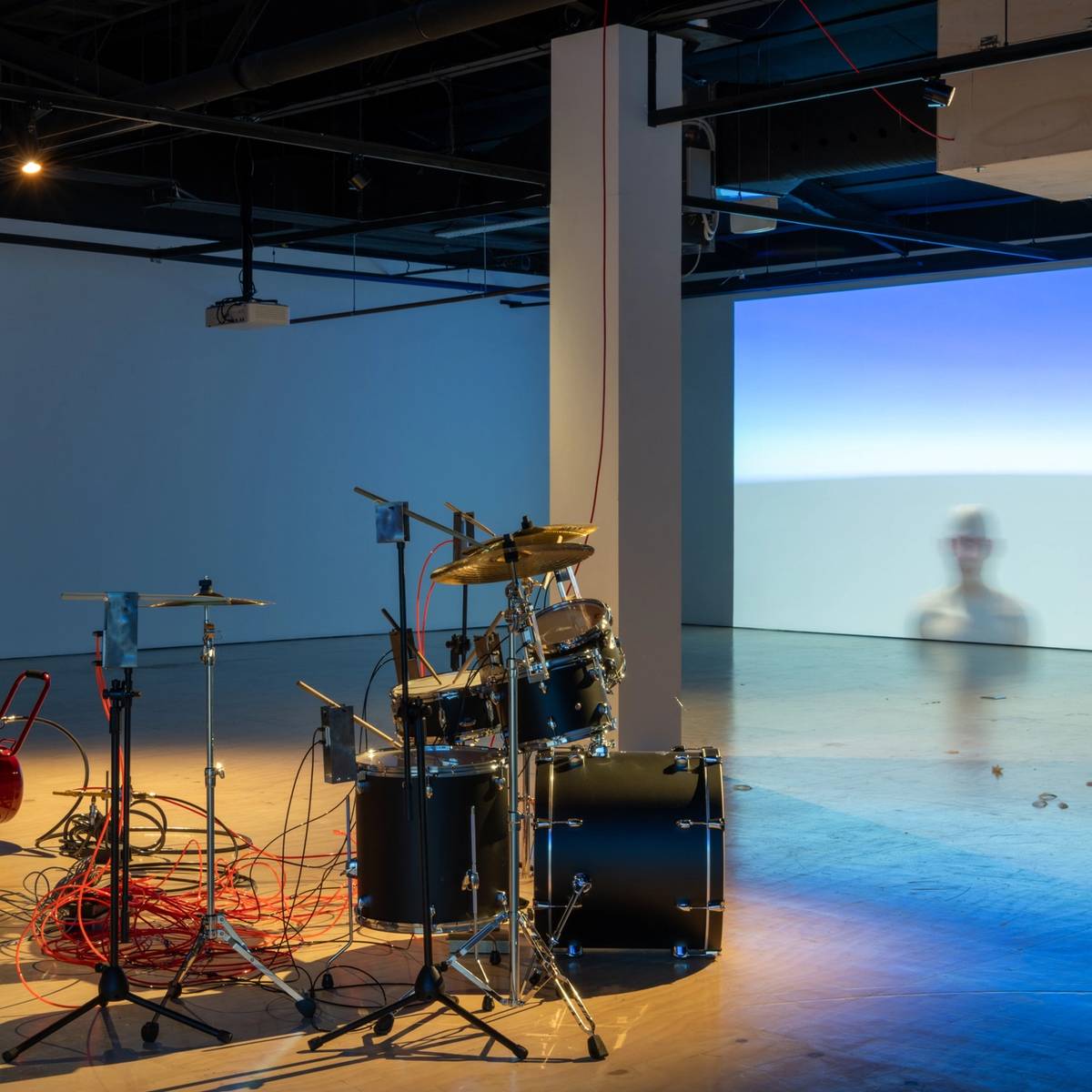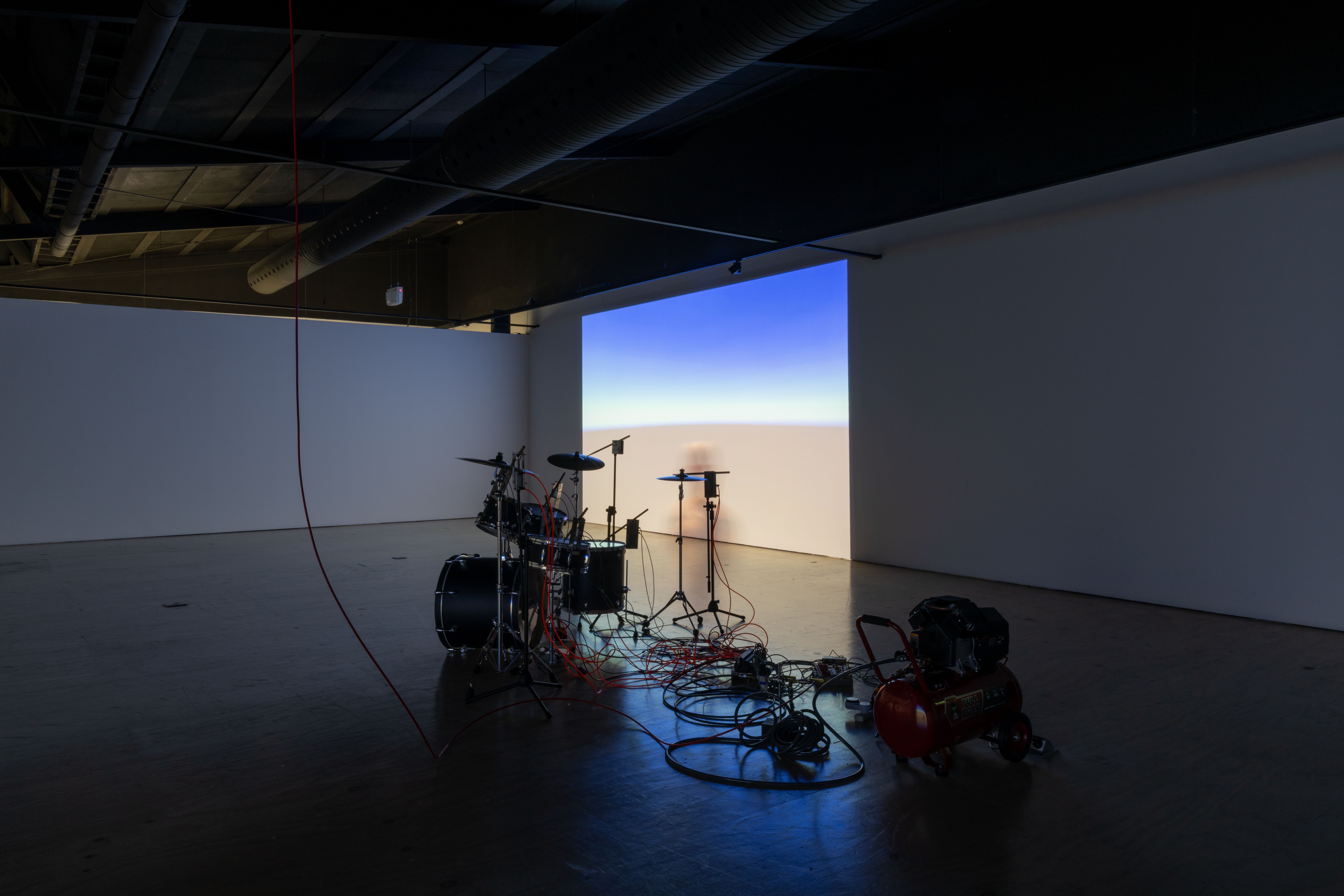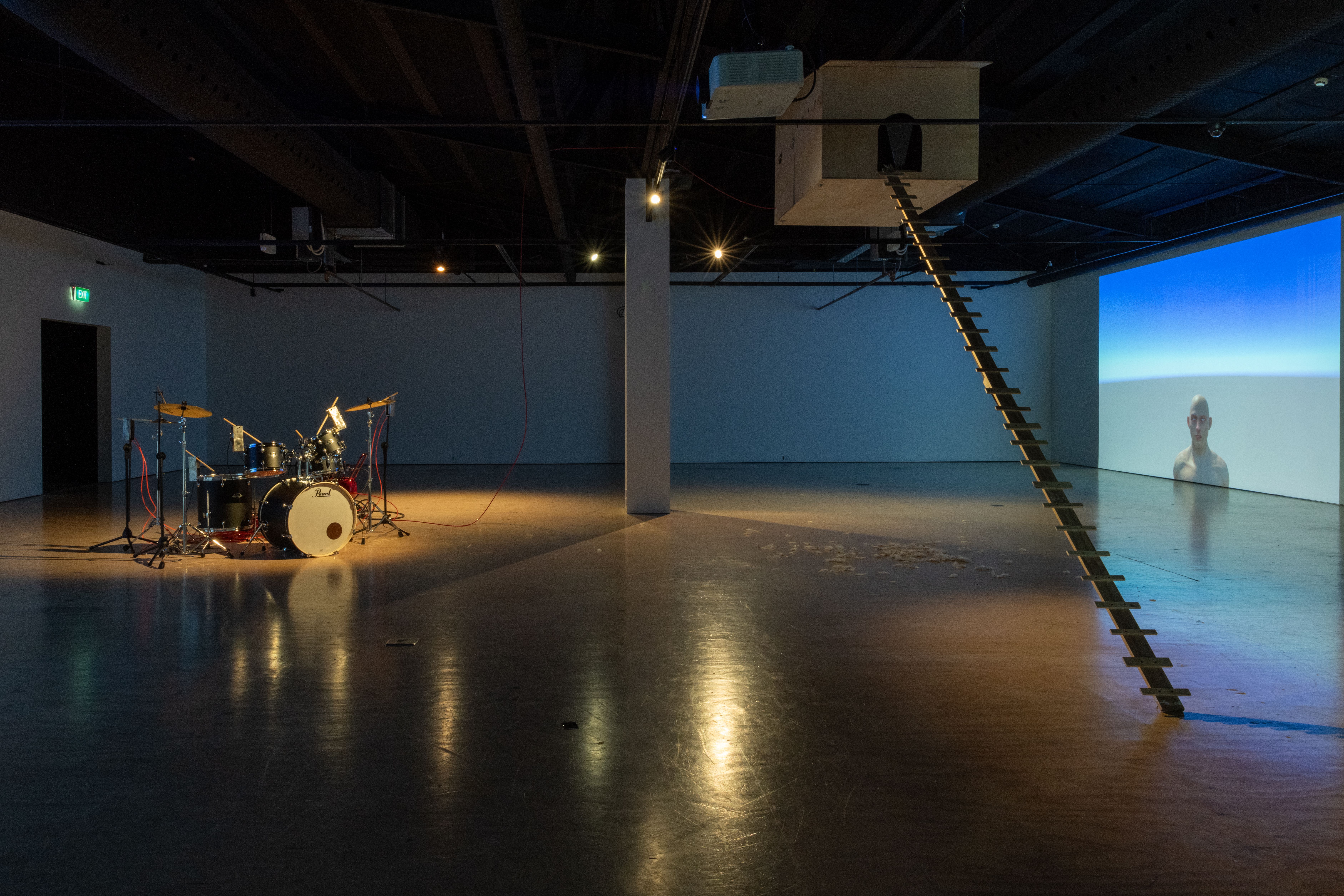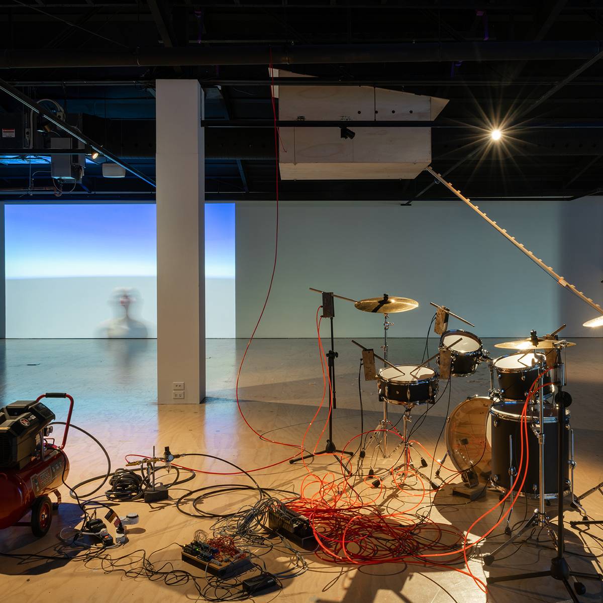 Welcome to Sean Kerr's exhibition - a convoluted playground of sounds, sights, and mischief. Here, observe a plywood henhouse, suspended eerily in a black abyss above your heads \u2013 a cheeky provocateur that dispenses feathers amidst echoes of clucks. Near the centre, an air compressor grumbles, powering the unruly machinery that Kerr is known for: notably, a self-playing drumkit drumming to an unheard rhythm. Two uncanny AI avatars, hairless, naked males, converse, sing, and dance in an otherworldly spectacle. \\n\\nKerr's work draws heavily on elusive communication theory, sprinkled with dashes of slapstick comedy, probing deep into the murky underbelly of social and technological interfaces. Much like his previous works, this exhibition could be seen as an observation on the chaotic realities of life itself, or perhaps a satirical jab at our futile attempts to control the uncontrollable. \\n\\nSean Kerr - a master of disarray, an orchestrator of the absurd. His creations occupy a curious space, perched precariously between reality and hyperreality, forcing his spectators to question the normalcy of their quotidian interactions. Constantly pushing boundaries, he melds the mechanical with the theatrical, creating an immersive experience teetering on the brink of the comically dystopian. The show will surely leave you pondering long after you've left the gallery's confines. \\n\\nRemember, the artist loves to keep us guessing, perhaps we are all part of his mischievous engagement, perpetually caught in the crossfire of his relentless machines.