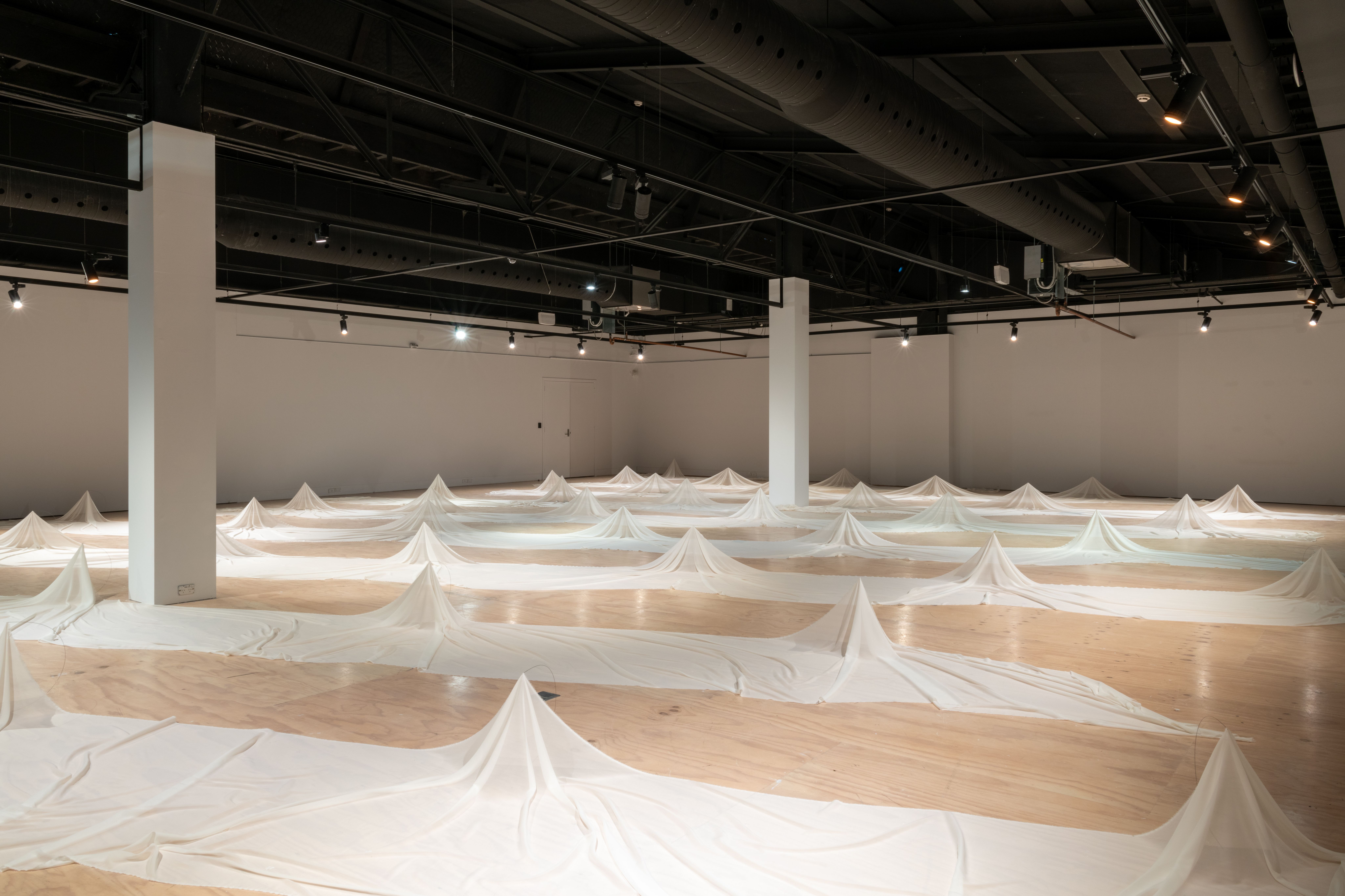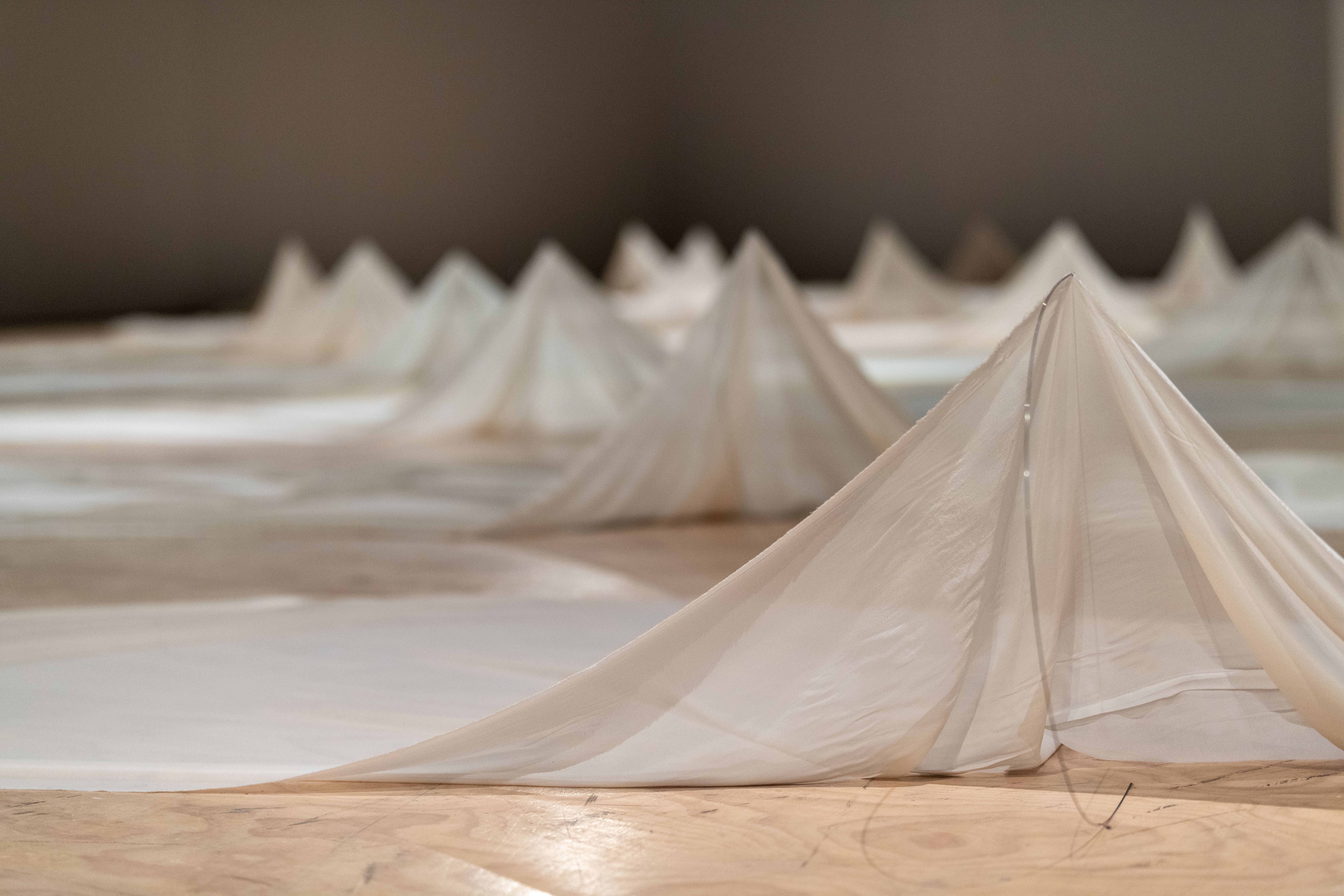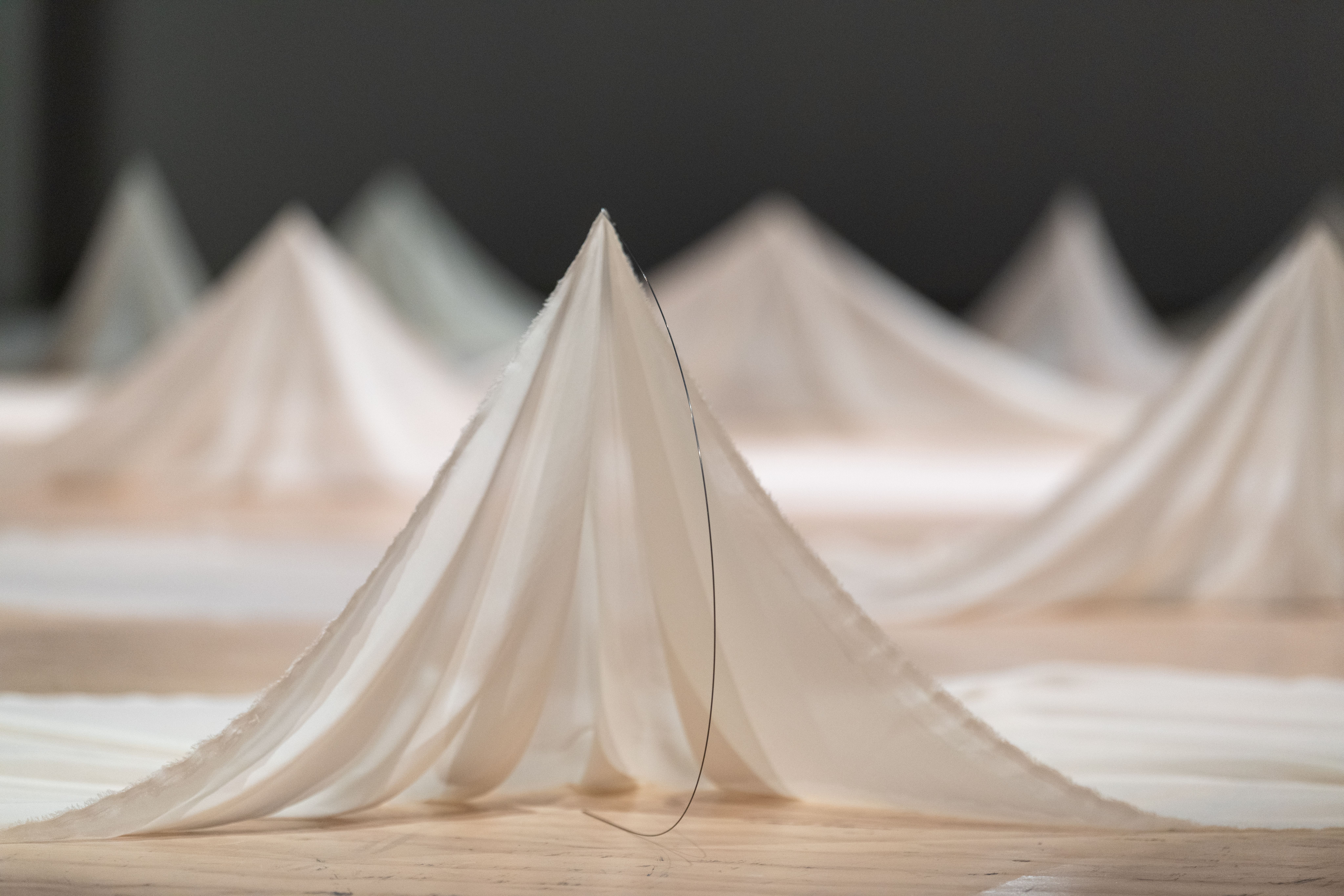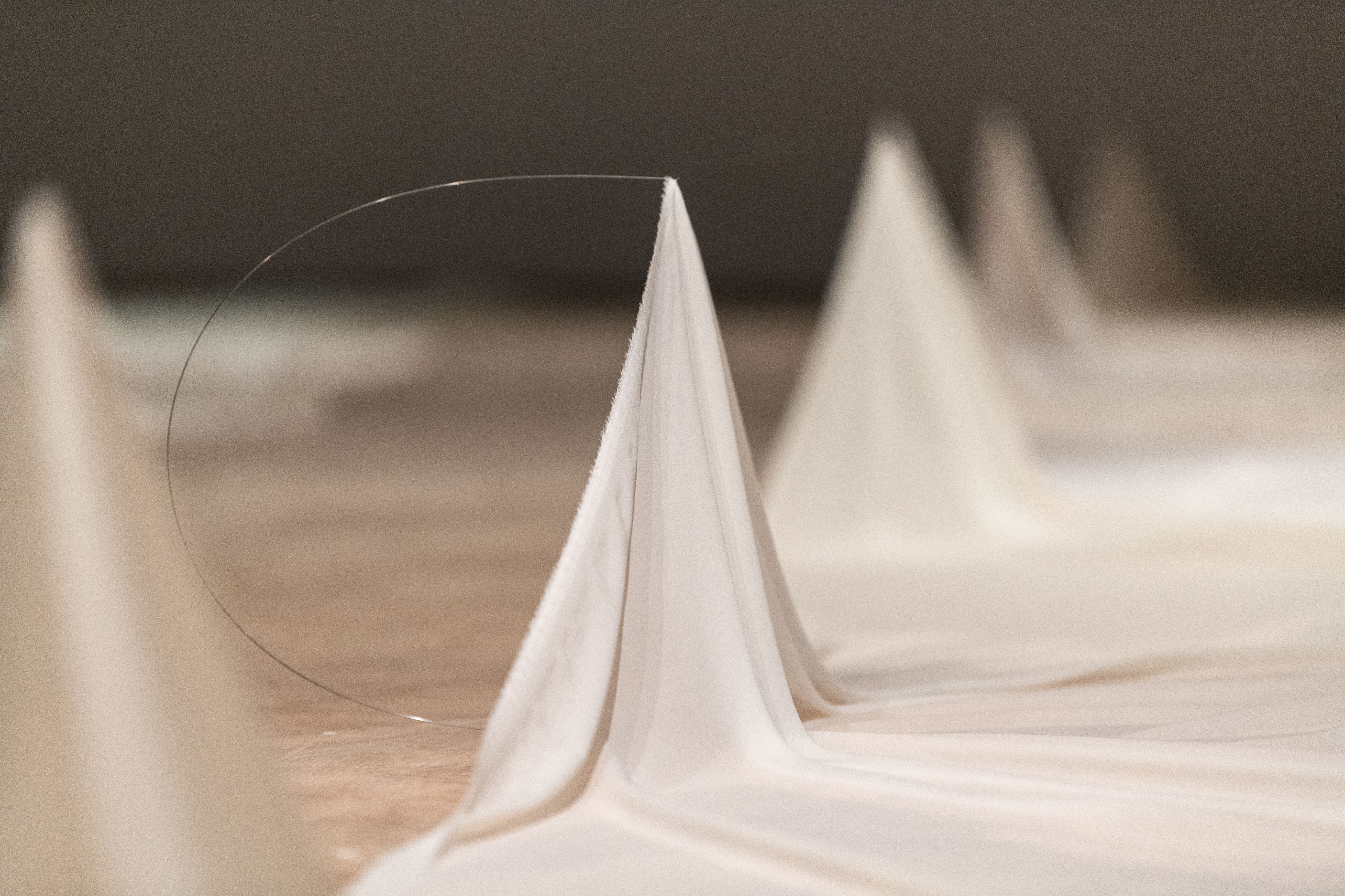 The exhibition leaves behind celebration for mourning, a small departure because the two are so closely intertwined. There can be no mourning without a remembered celebration. Materially, the show has also been simplified to two components: silk and steel.