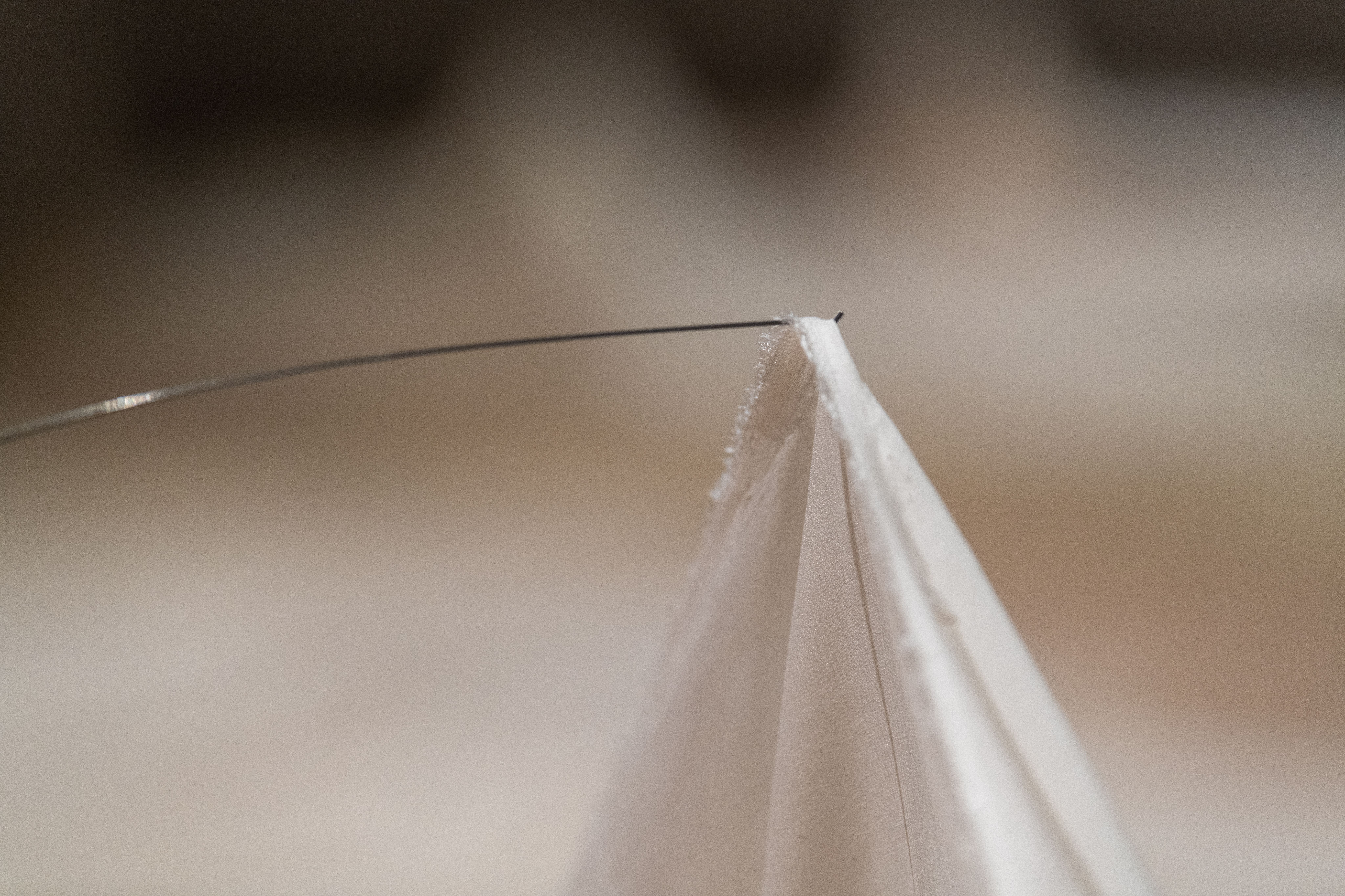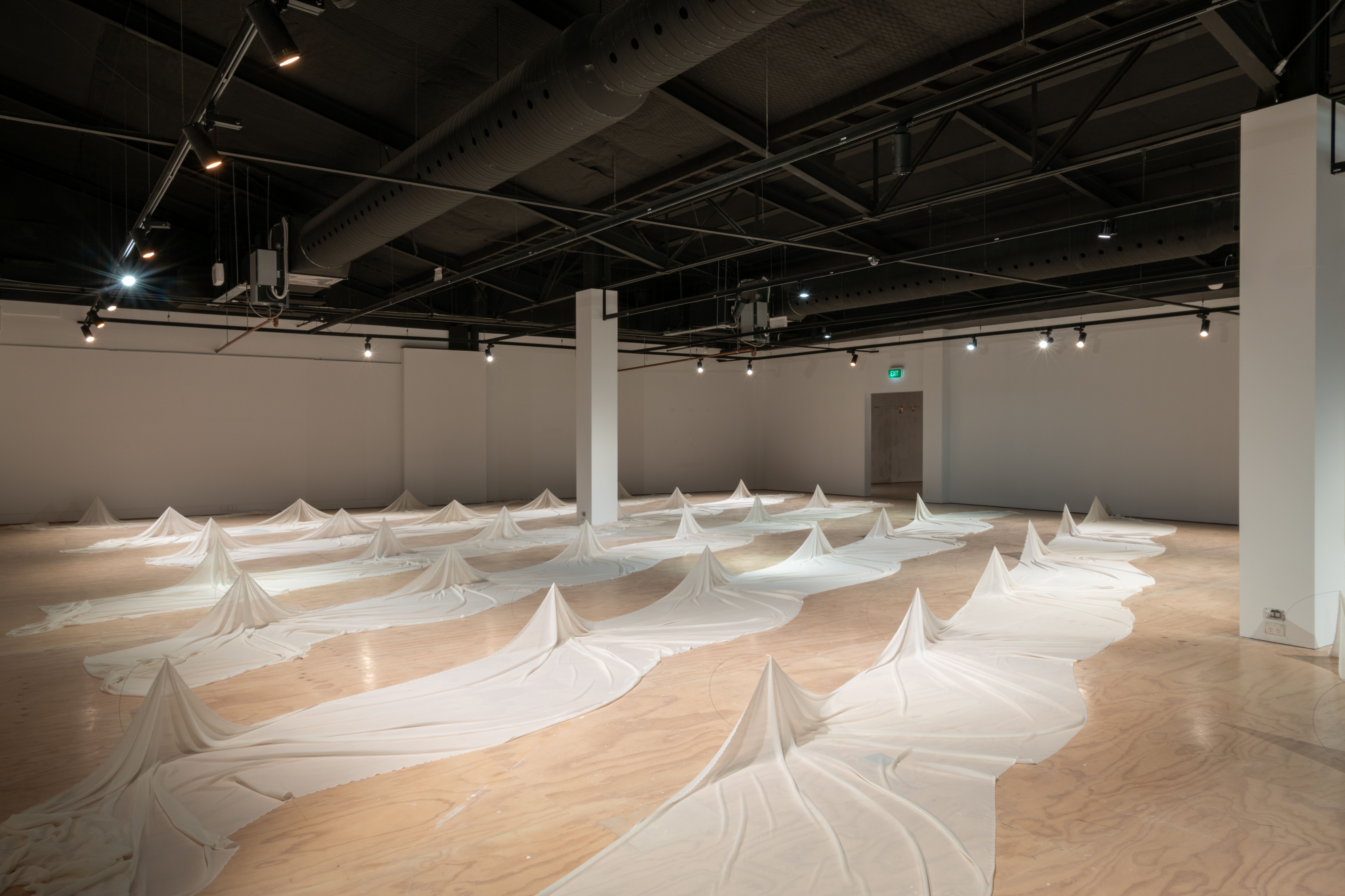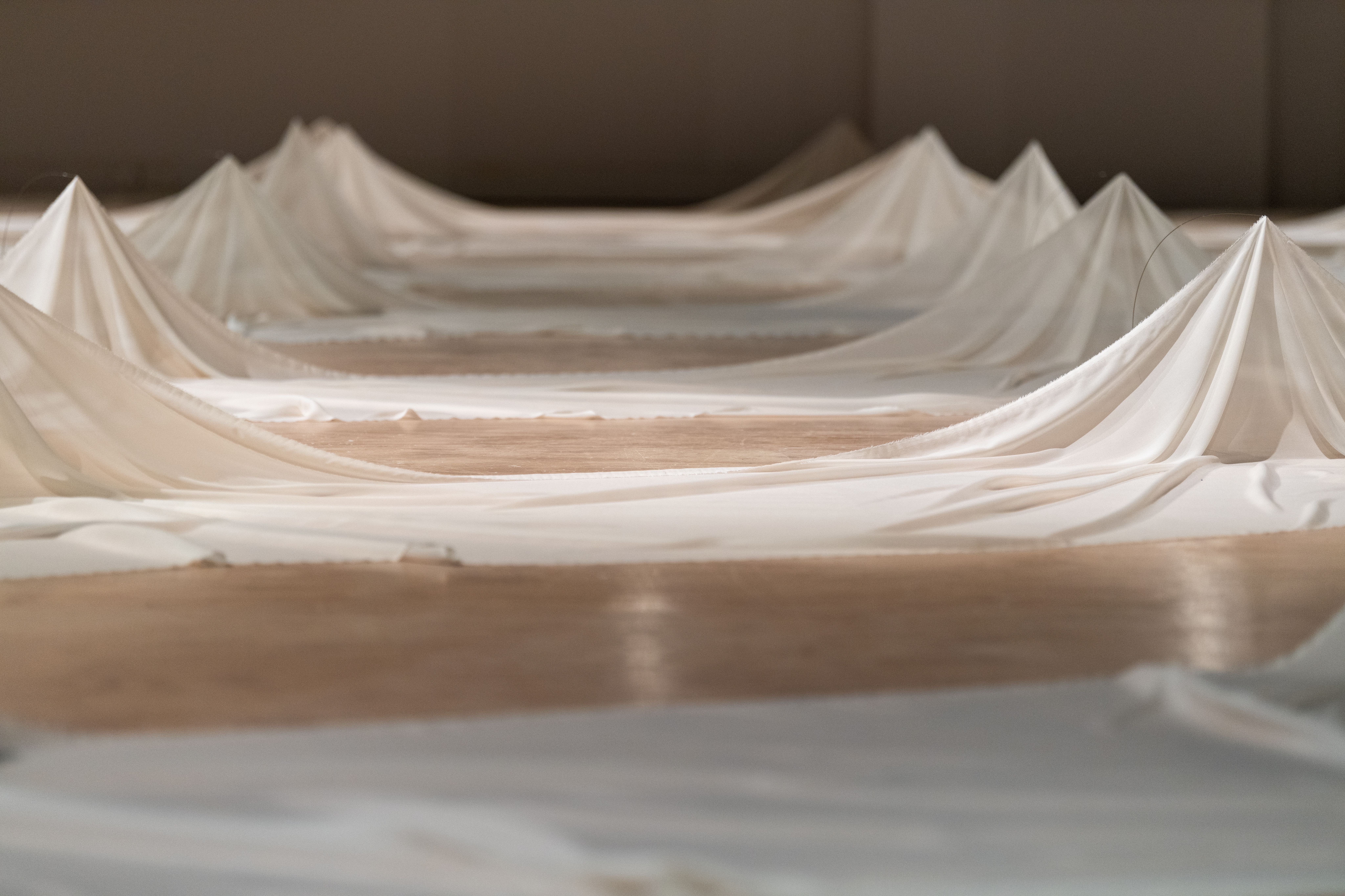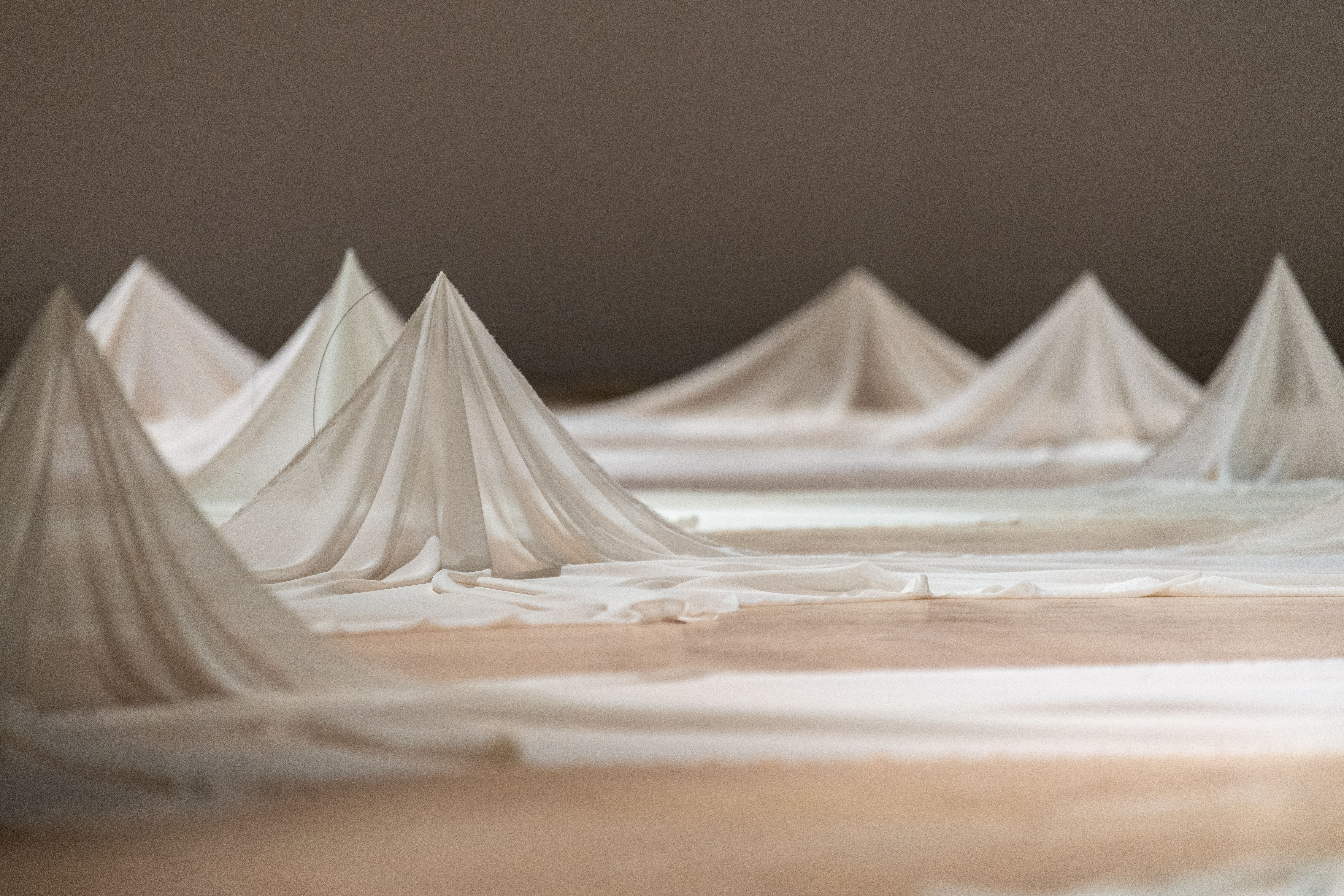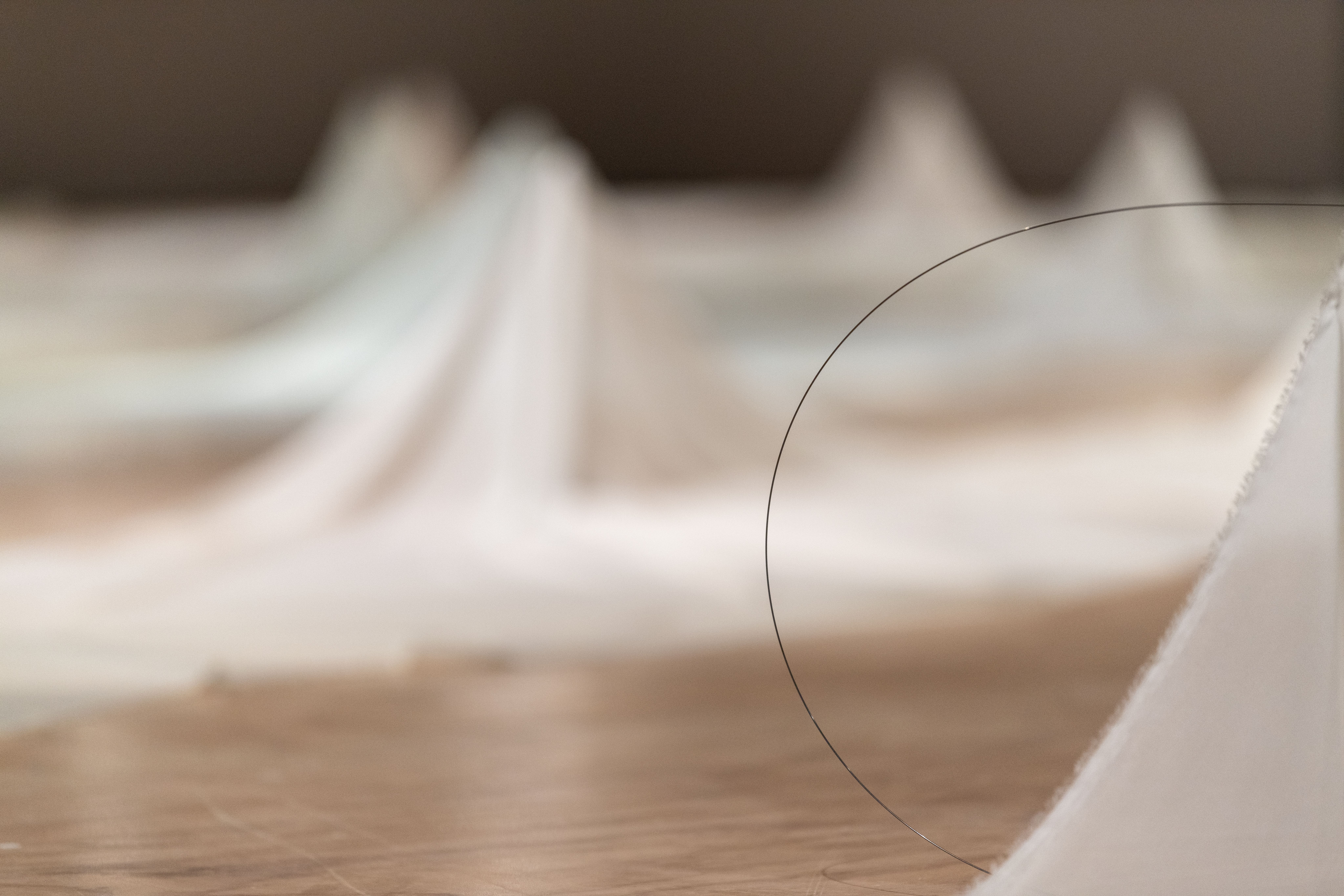 The exhibition leaves behind celebration for mourning, a small departure because the two are so closely intertwined. There can be no mourning without a remembered celebration. Materially, the show has also been simplified to two components: silk and steel.